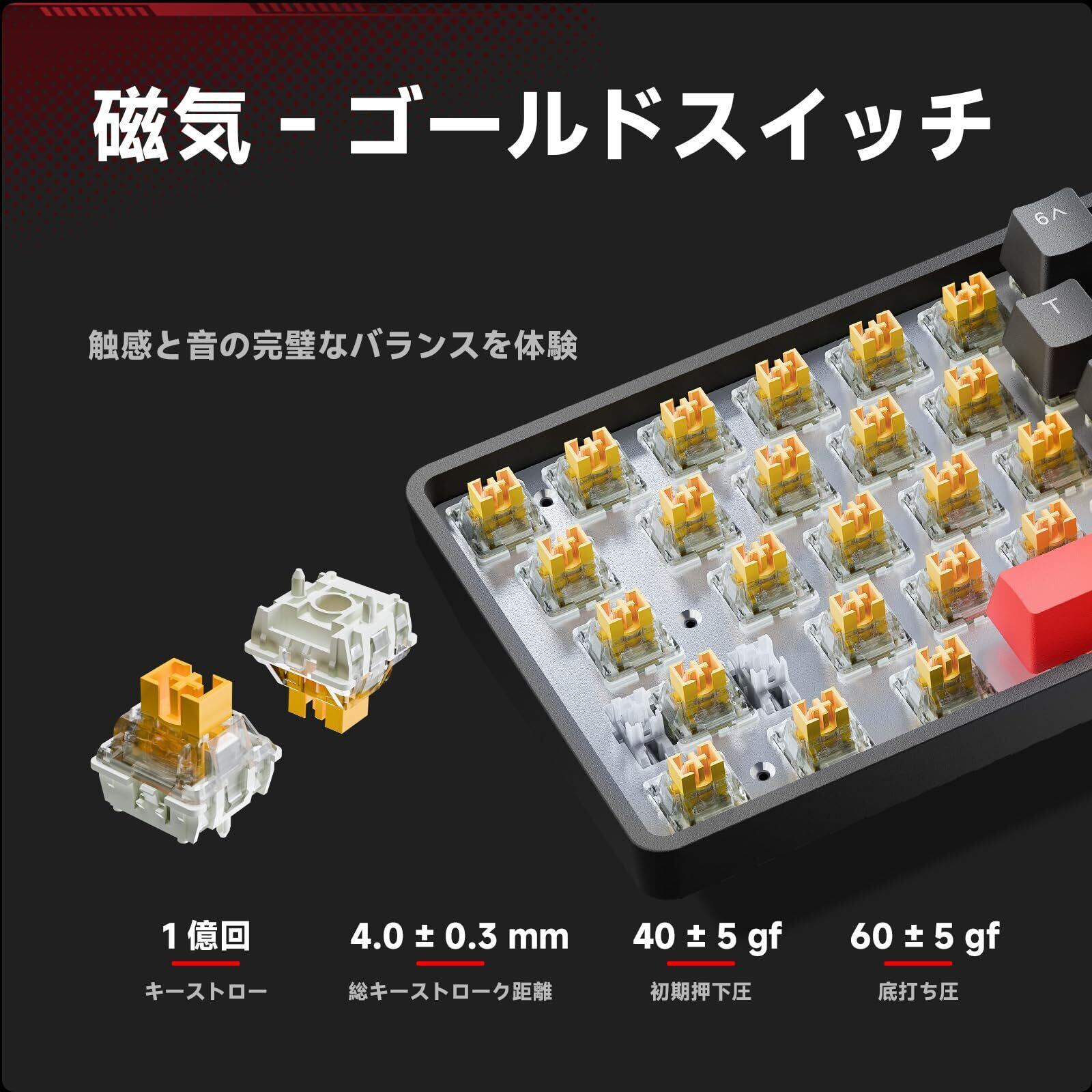 【磁気スイッチ】 ホール効果で作動します,金属リーフ/ピン/光学、その他の繊細な継手はありません。 キーの打鍵回数は1億回にも耐えられ、従来のキーストライキング寿命の2倍です