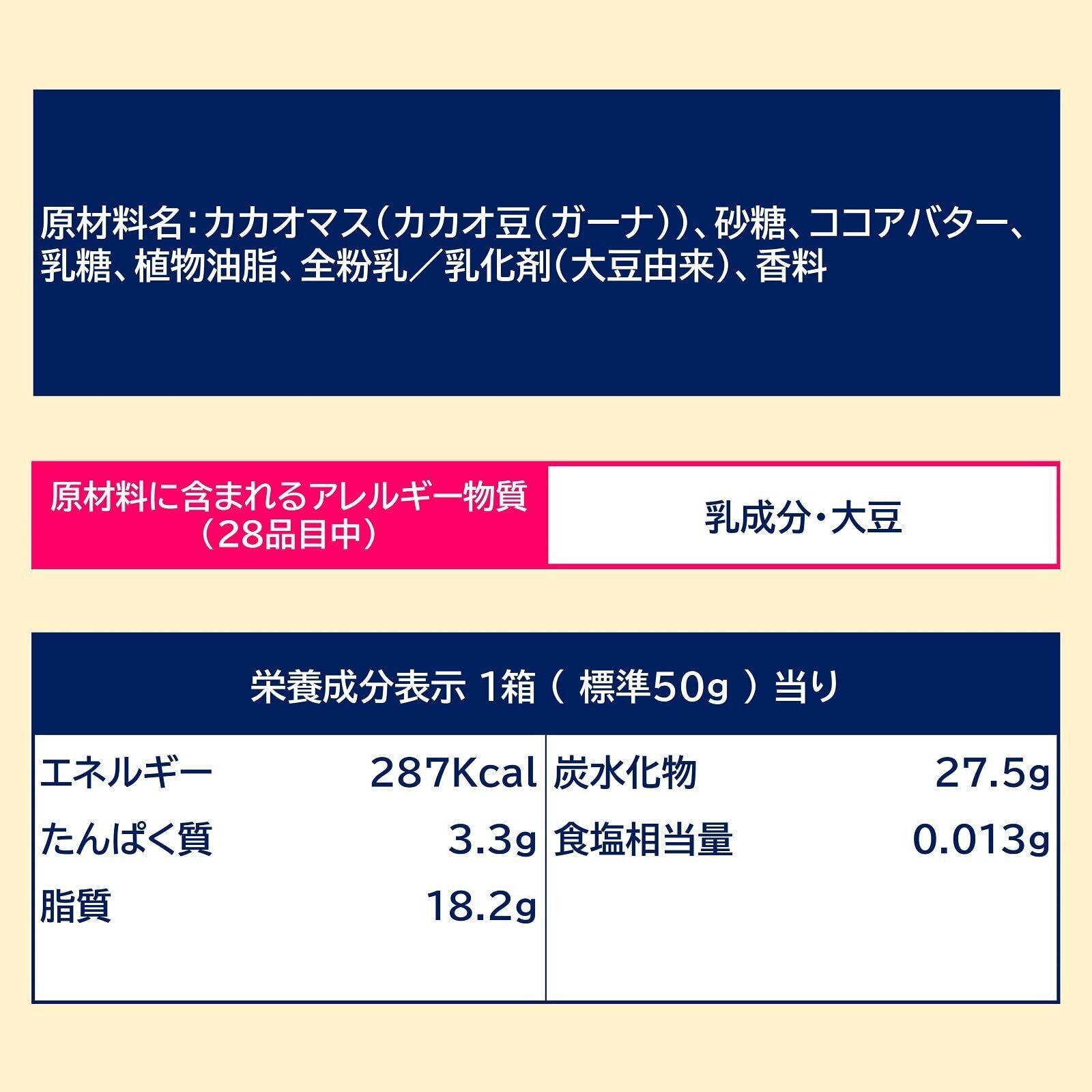 カカオマス(カカオ豆(ガーナ))、砂糖、ココアバター、乳糖、植物油脂、全粉乳/乳化剤(大豆由来)、香料
