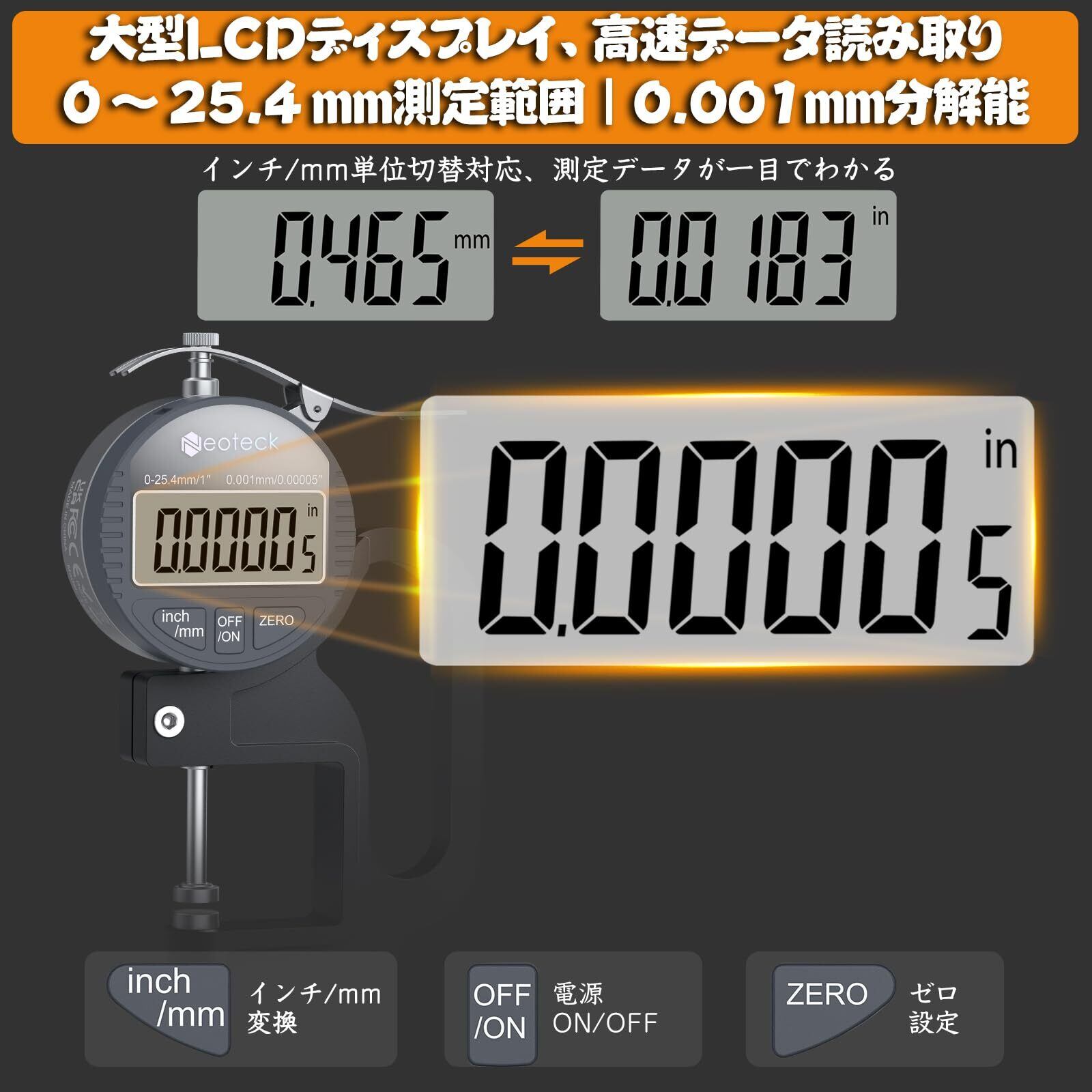 Neoteck デジタルシックネスゲージ 厚さ測定器 デジタル厚さ測定器 精度0.001mm 測定範囲0〜25.4mm アルミ合金製 LCD大型液晶画面 高精度厚み測定器