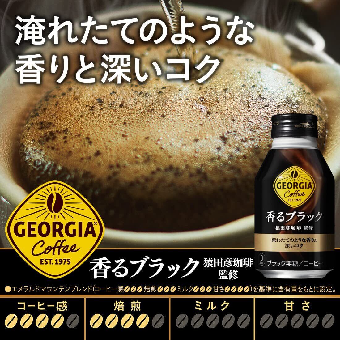 挽きたてのコーヒー豆の香りを封じ込める日本初の「挽きたてアロマ製法」と、ボトル缶の広口形状と高い密封性を活かし、淹れたてのようなコクと香りにこだわった「ジョージア 香るボトル缶シリーズ」。『ジョージア 香るブラック』は、従来の「挽きたてアロマ製法」に加え、ハンドドリップで行われる“蒸らし"の工程を取り入れることで、さらに香り高いコクと深みのある味わいを実現したブラックコーヒーです。飲んだ後に、もどってくる「もどり香」もお楽しみください。