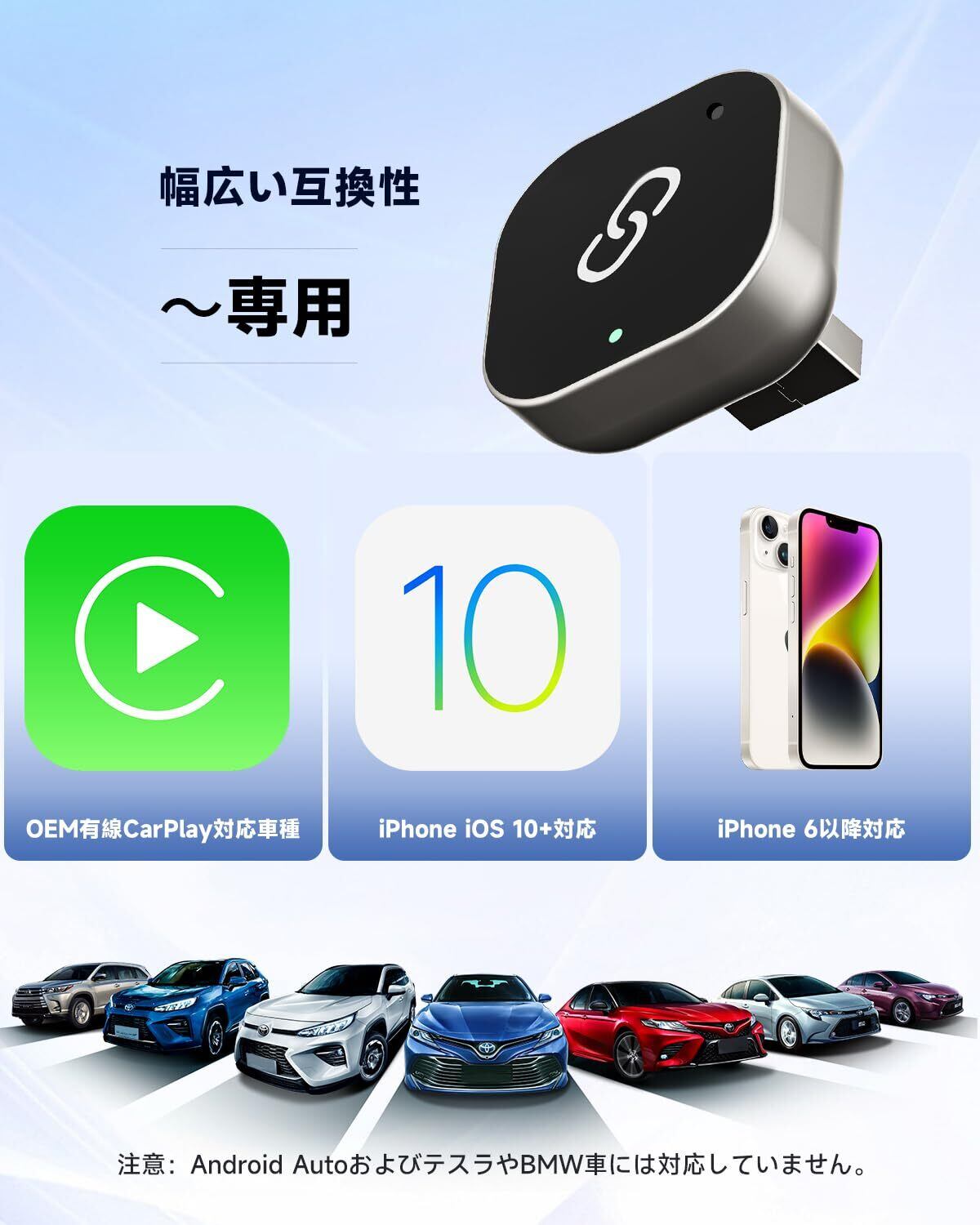 ✨【購入前に必ずお読みください】 ①このCarPlay ワイヤレスおよびAndroid Autoワイヤレスアダプターは、2017年以降にOEMの有線CarPlayおよび有線Android Autoが搭載されている車両でのみ使用可能です。 ②車両に有線Apple CarPlayまたは有線Android Autoの機能があることをご確認ください。 ③Wi-FiとBluetoothを同時にオンにし、他のデバイスに占有されていない状態にしてください。