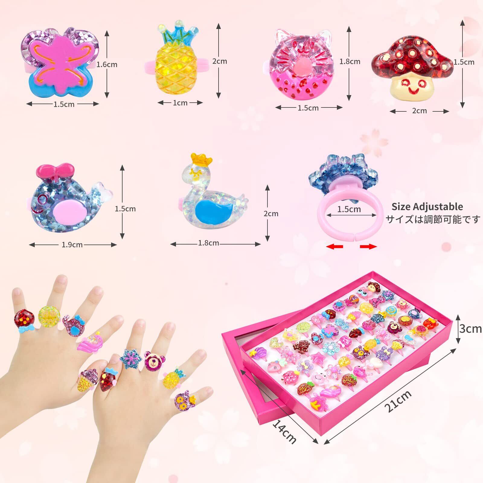 【超可愛いプレゼント】指輪はピンク色、上部が透明の綺麗なボックスに入れます。完璧に誕生日、クリスマス、こどもの日、縁日にプレゼントとして最高です。