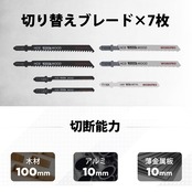 【セット内容】ジグソー、ブレード7本、金属ガイド定規、六角レンチ、除塵パイプ、日本語取扱説明書です。電流:6A。消費電力:600W。ストローク数:800-3000min-1。ストローク幅:17.4mm。最大切断能力:木材100mm以内、スチール10mm以内、アルミ20mm以内。