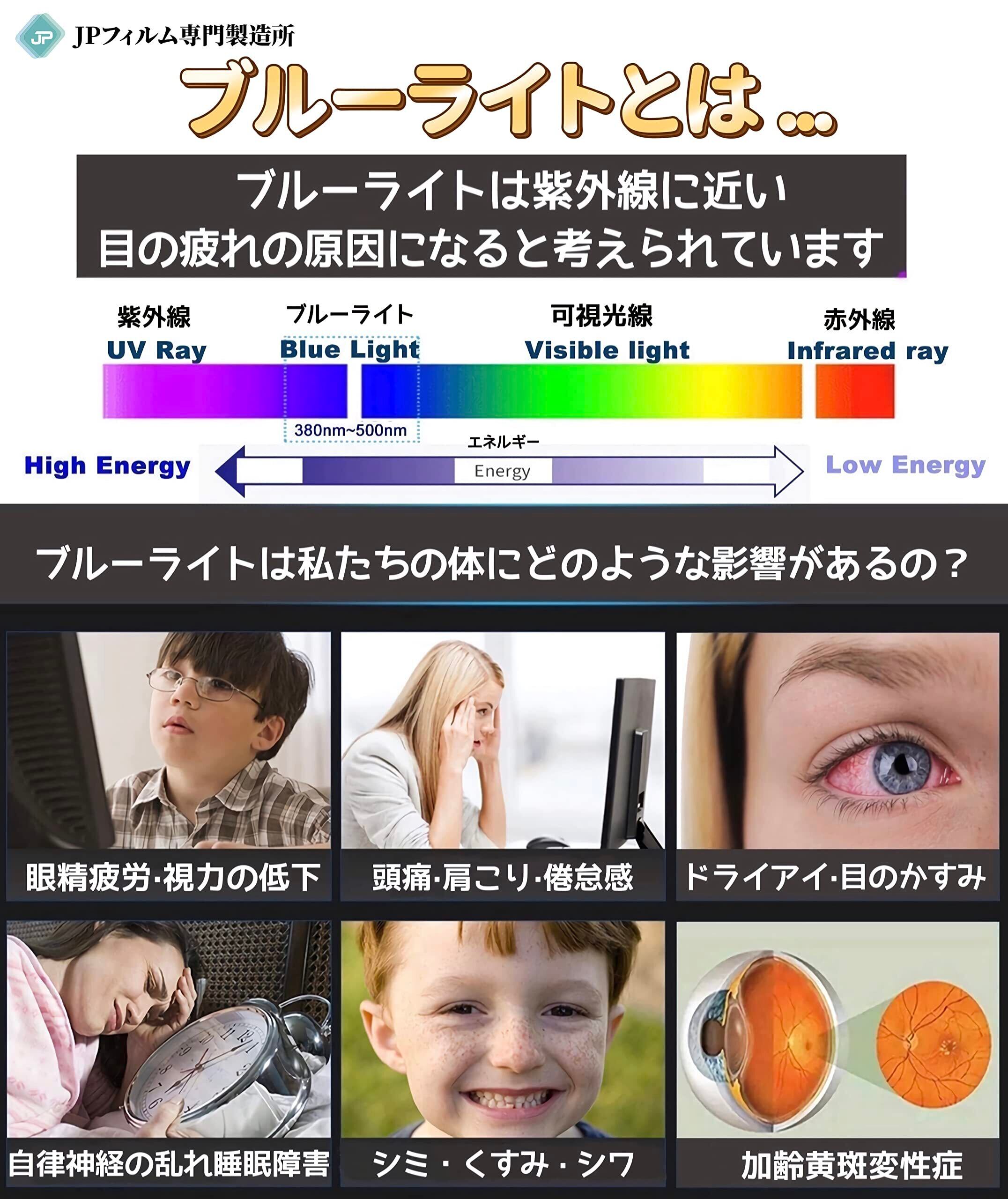 ディスプレイを見続ける機会が多い現代人の目を考えて開発のフィルムです。ブルーライトカットフィルムは液晶ディスプレイが発する光の中の青い部分「ブルーライト」最大約60%をカットできます、お子様の目を保護します。