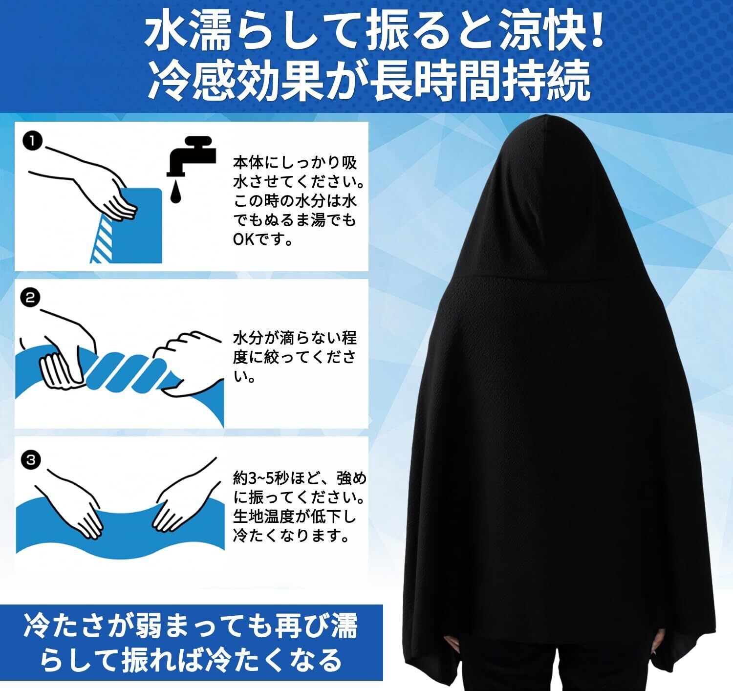 【水濡らして振ると涼快!冷感効果が長時間持続】冷感 ポンチョ 生地に水分が含まれていれば、振るだけで何度でも涼しさが再現されます。涼しさが弱まったように感じる場合は、生地の水分量が減少しているためで、その場合、再度濡らして振ると、何度も涼しさを感じることができます。この手順を繰り返して、数時間にわたって涼しさを保つことができます。