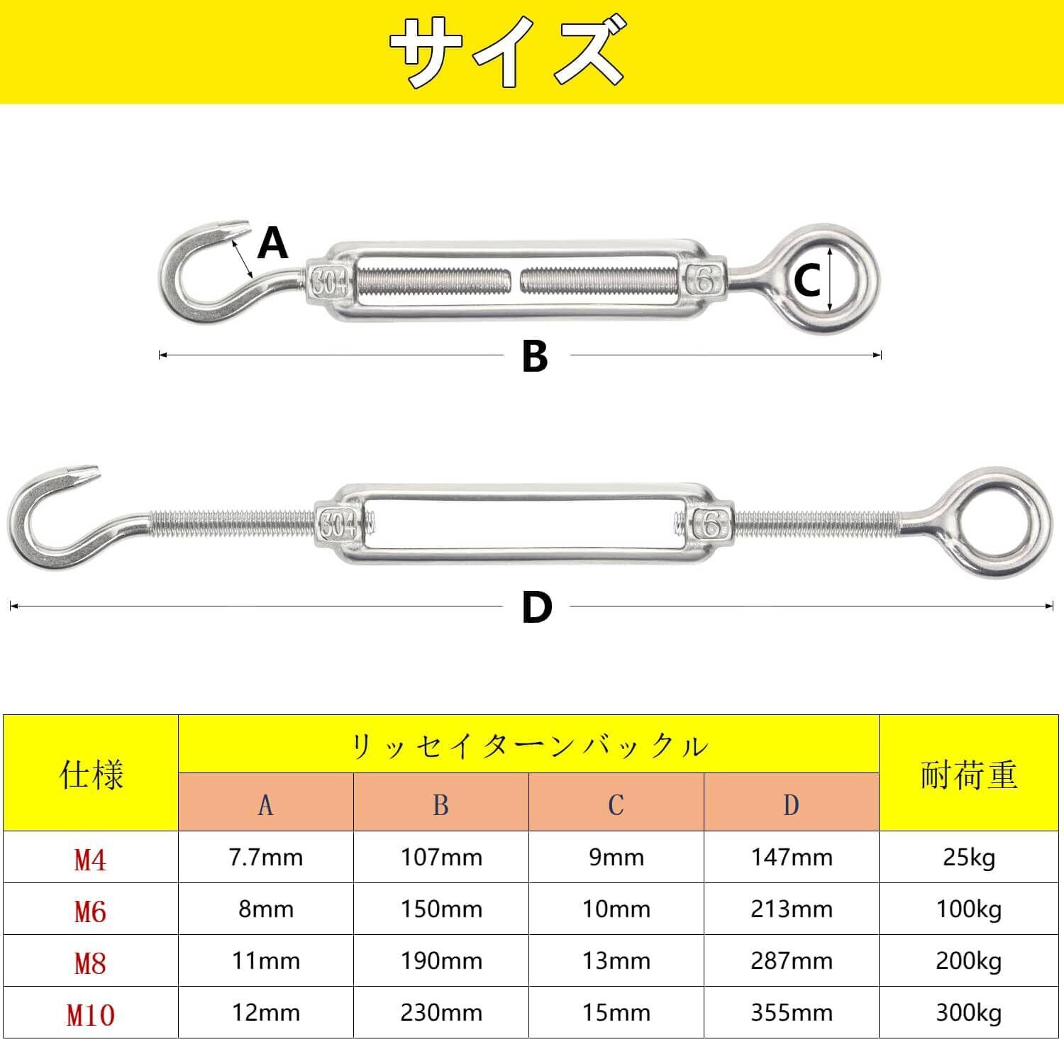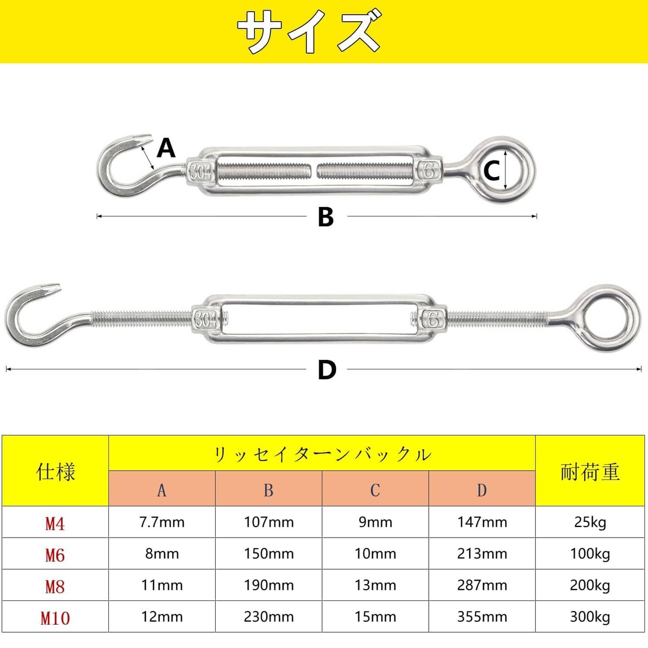 【材質】:ターンバックルはSUS304ステンレスを使用しており、錆びにくく頑丈で耐久性があります。表面は滑らかで手触りがよく、アウトドアや日常的な使用に最適です
