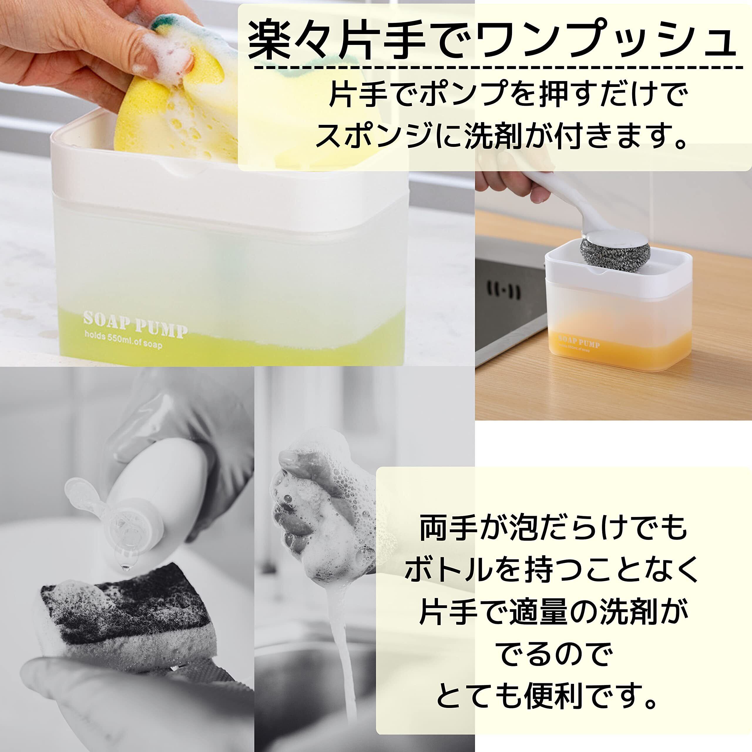 【スポンジに適量の洗剤がワンプッシュで】 片手で軽くポンプを押すだけで、スポンジに適量の洗剤がスムーズに付きます。洗剤の追加も簡単で、手間をかけることなく効率的にお使いいただけます。 泡だらけの両手であっても、ボトルを持つ必要がないため、簡単にお使いいただけます。