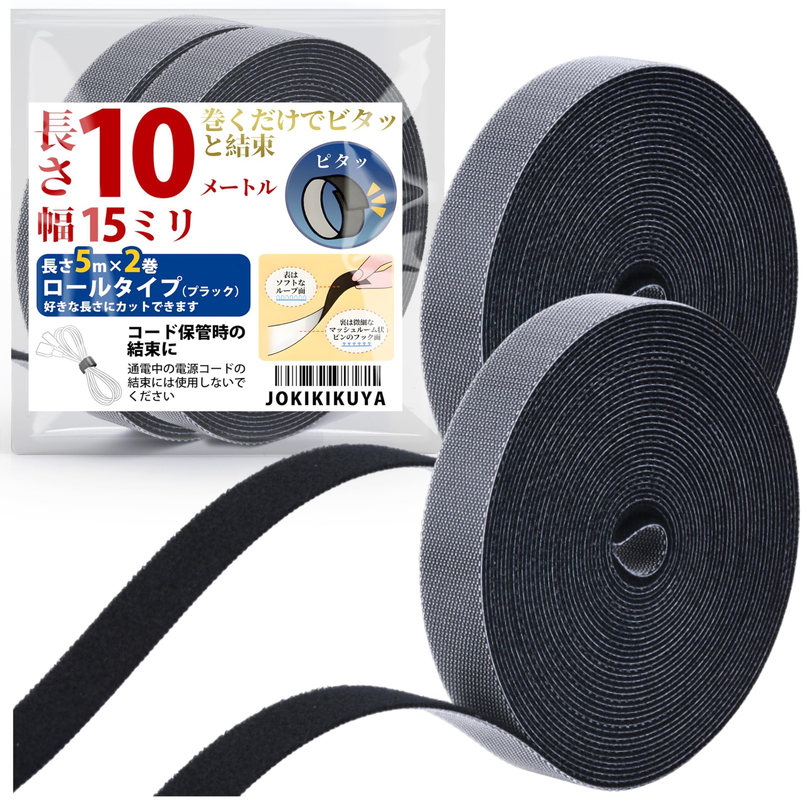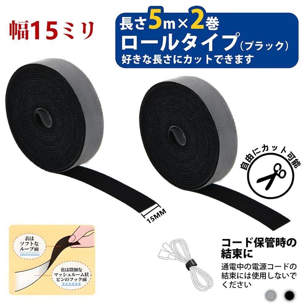 ✨幅広1.5cm × 長さ5m×2巻=合計10mの超ロング仕様 汎用性の高いブラックカラーを採用。1.5cmの幅広設計で、さまざまなケーブルやシーンに対応し、1セットで整理ニーズをしっかりカバー。