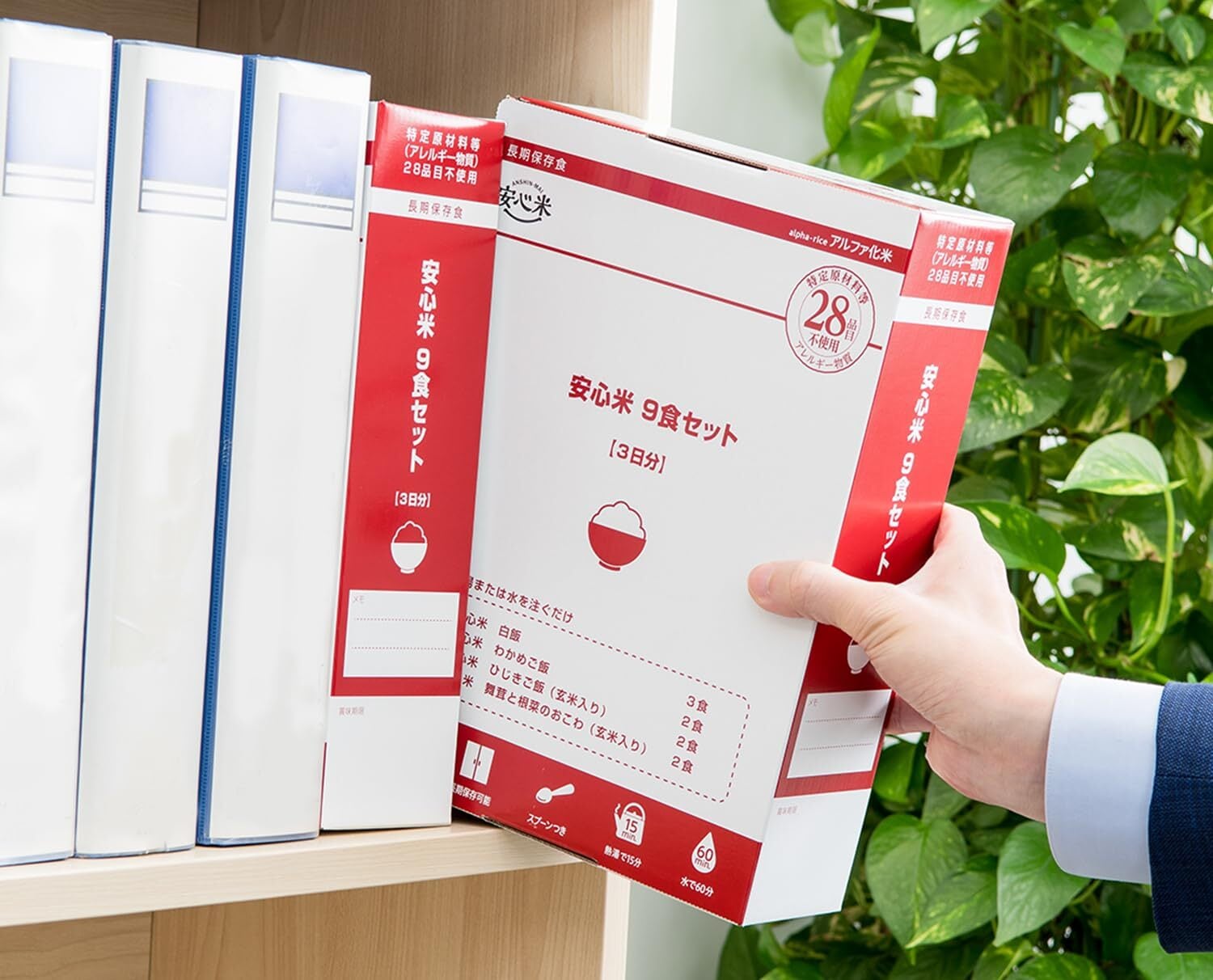 『白飯』、『わかめご飯』、『ひじきご飯(玄米入り)』、『舞茸と根菜のおこわ(玄米入り)』の4種類を詰め合わせ た、救援物資が供給開始されるまでの最低3日分(一人当たり3食×3日分=9食)のセットです。 (農林水産省「緊急時に備えた家庭用食料品備蓄ガイド」より) [ 日本災害食学会認証、及びハラール認証商品 ]