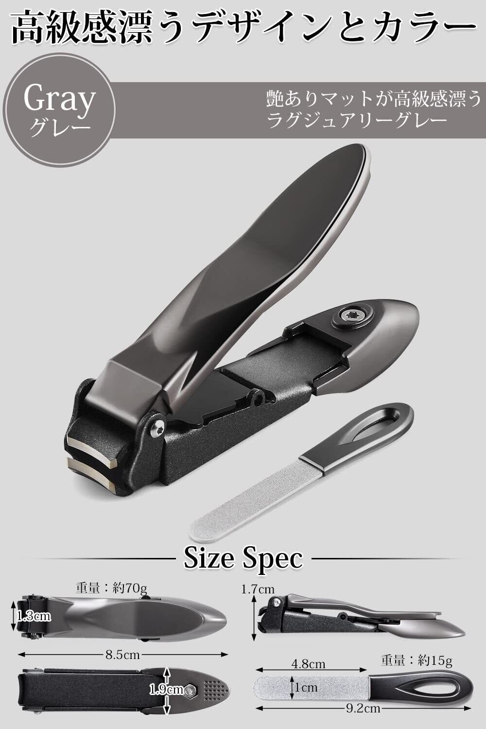 ●爪切りとヤスリのセットです。●爪が飛び散らないような設計となっていますので、従来のように爪を捨てるときに爪が飛び散ってしまうということがありません。●切れ味にも追及しており、軽い力でスパッと切れるように刃を調整しておりますので、安い爪切りのように切れなくてイライラすることがありません。●高級感があるスタイリッシュなデザインを採用しており、インテリアにも馴染みます。●ヤスリは高級サロンでも採用されているものを採用しており、爪を削るには丁度よい粗さのヤスリになっています。