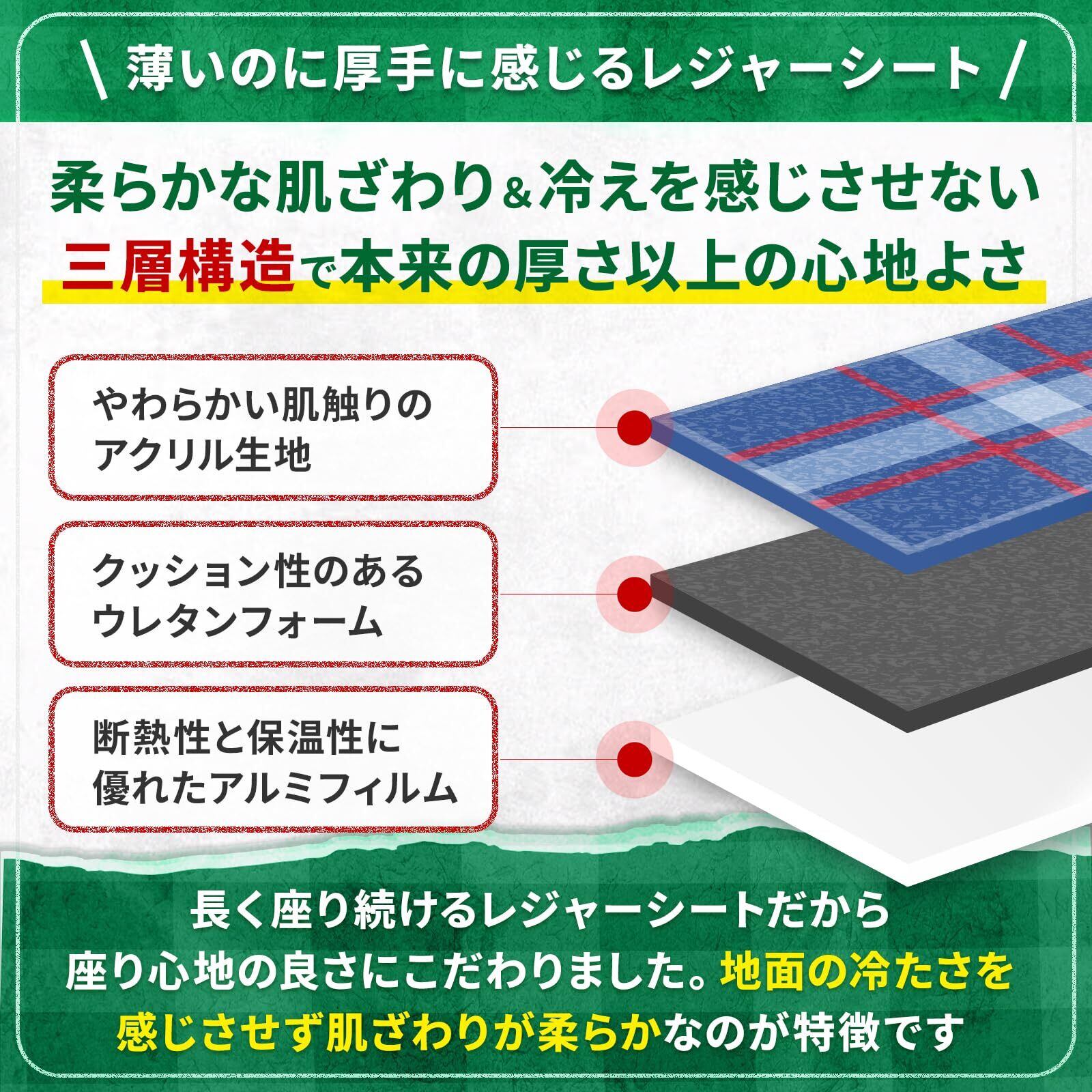 柔らかな肌触りと、冷えを感じさせない三層構造。地面の冷たさを感じさせず肌ざわりが柔らかなのが特徴。クッション性もあるので、座り心地が抜群。