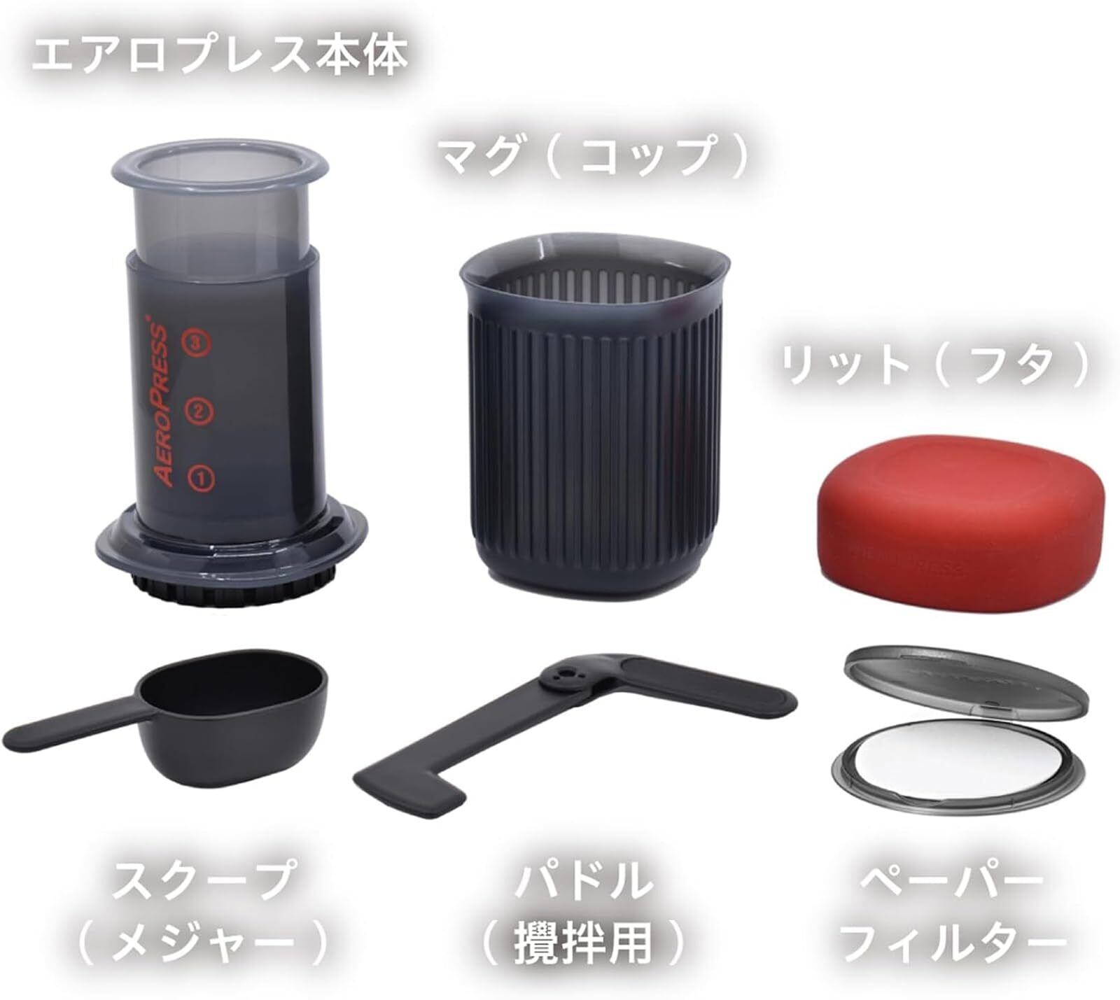 セット内容:エアロプレス本体、マグ (コップ)、リット (フタ)、スクープ (メジャー)、パドル (攪拌用)、ペーパーフィルター