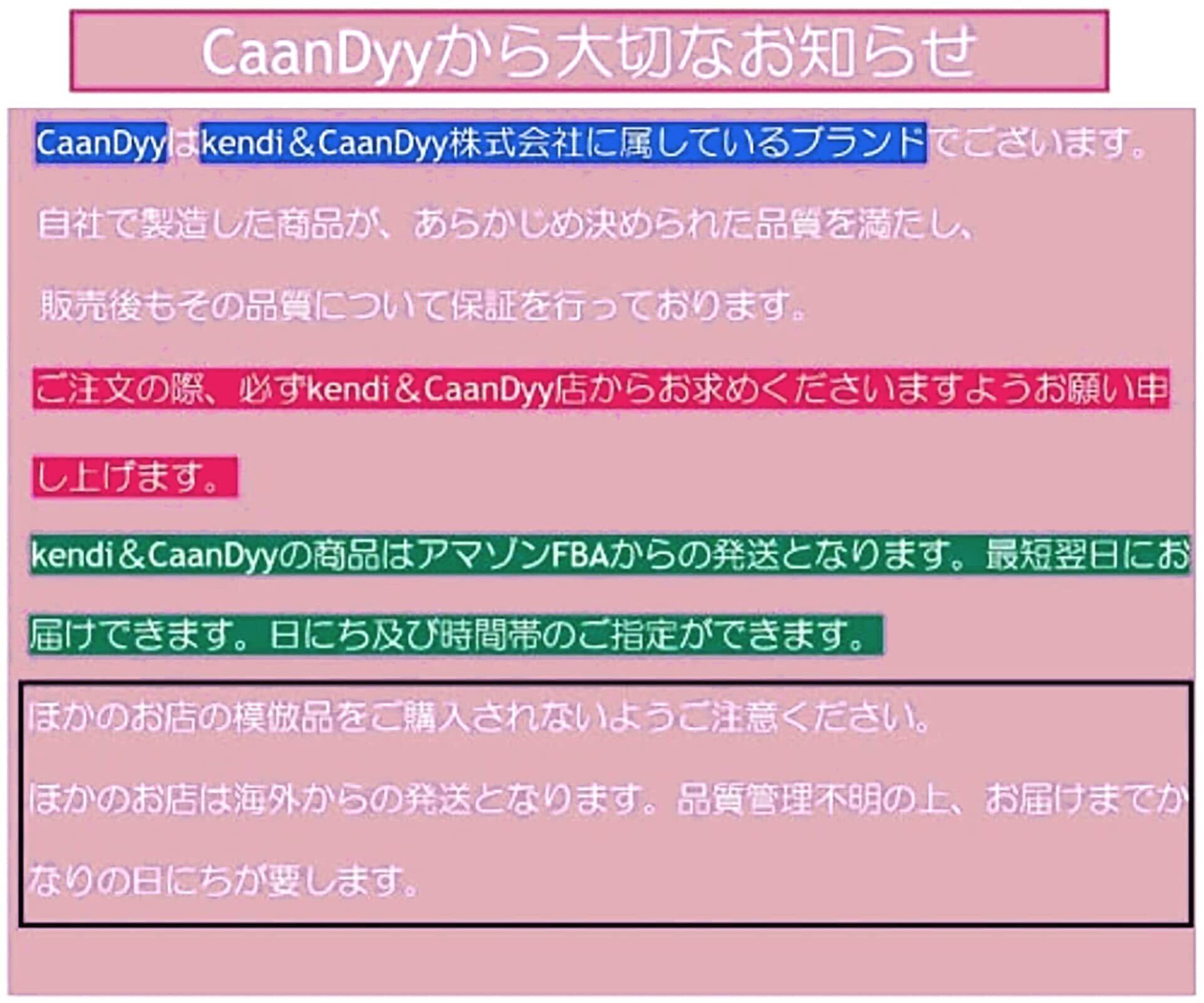 ※ CaanDyyはkendi&CaanDyy株式会社のブランドでございます。他のお店にてご購入された場合、当店は品質できかねますので、ご注文際、必ずFBAから出荷のkendi&CaanDyyからご注文をお願い申し上げます。