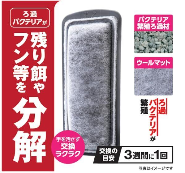 ■バクテリアスリムマット5個入 ろ過バクテリアが残り餌やフン等を分解。 バクテリア繁殖ろ過材+ウールマット。 ろ過材の中でバクテリアが繁殖し、残り餌やフン等を分解。 ■活性炭スリムマット5個入 ニゴリ・黄ばみ・悪臭の元を吸着。活性炭+ウールマット。 活性炭がニゴリ・黄ばみ・悪臭の元を吸着。 ■スポンジスリムカセット 1個入り スリムフィルター用スポンジカセット。粗ゴミ・ニゴリを取り除きます。