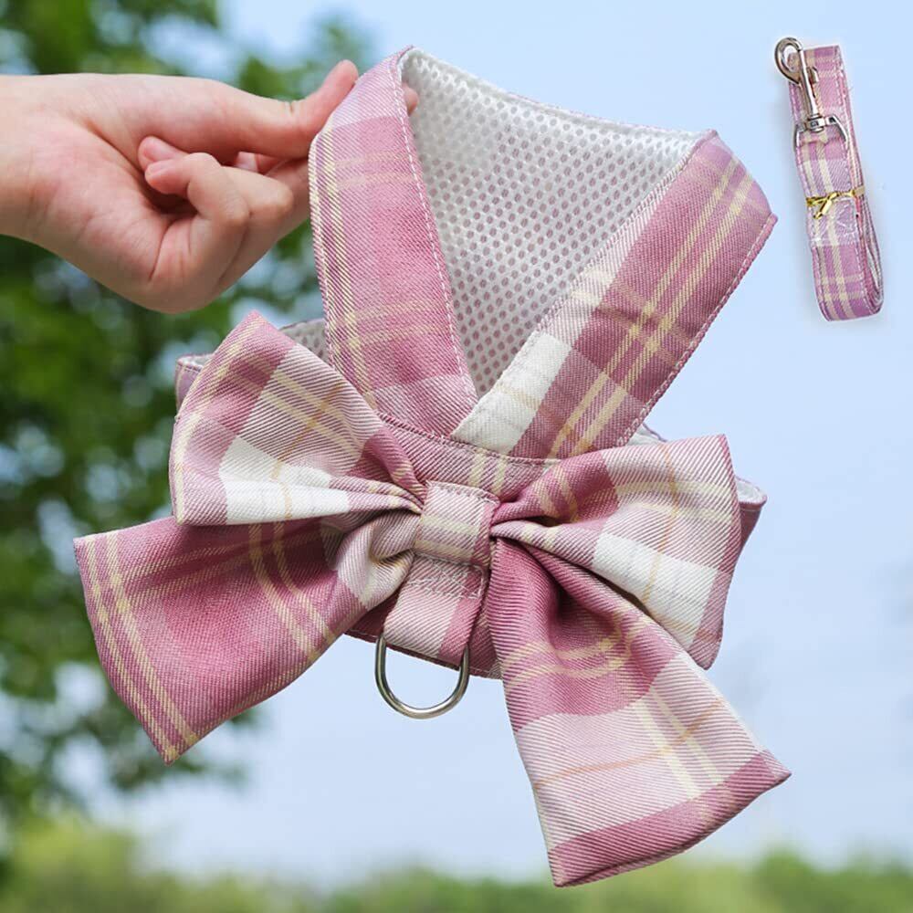 YOASONEK 犬 ハーネス 猫 ハーネス リード 可愛い チェック柄 JK制服 蝶結び メッシュ 通気性 ベスト 犬服 小型犬 猫用 コスチューム 仮装 胴輪 ハーネス おしゃれ リボン 簡単着脱 胸あて式 散歩 ハーネス 引っ張り防止 牽引ロープ リード ペット 小動物用 (M, ピンク)