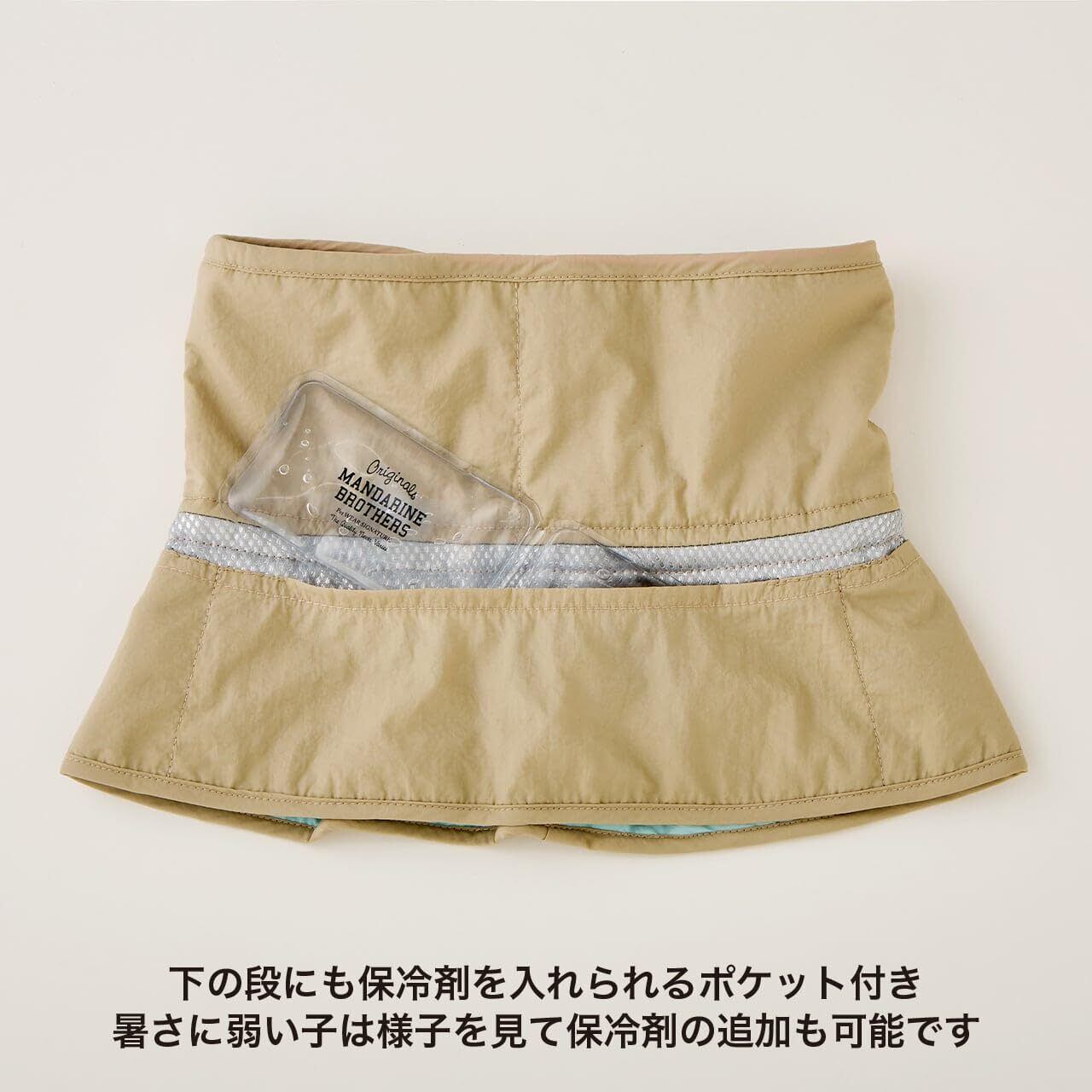 紫外線予防ができるうえ、冷感素材で涼しさを保つ暑さ対策アイテム。 保冷剤を収納できるポケット付きで、首まわりを効果的に冷やします。