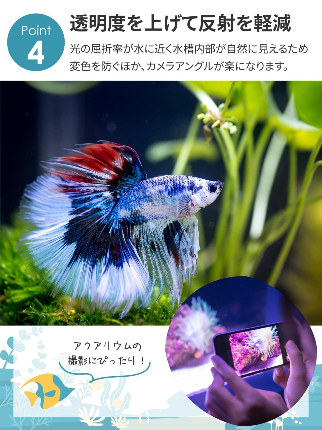 【透明度を上げて反射を軽減】水槽に光をより透過させるようにします。光の屈折率が水に近く水槽内部が自然に見えるため変色を防ぐほか、カメラアングルが楽になります。アクアリウムなどの撮影にピッタリ!