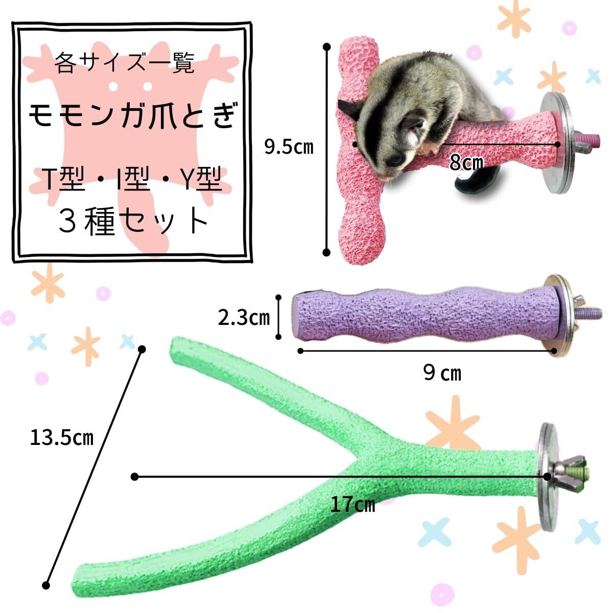 選べる3種類の形状でペットの習性に合わせた配置 このモモンガ爪とぎは、Y型、T型、I型の異なる形の3種類セットで、ケージ内の配置やペットの動きに応じて使い分けが可能です。Y型は枝状で自然な足場を再現し、T型とI型はまっすぐで安定感があるため、爪を削りやすい工夫が施されています。フクロモモンガだけでなくインコや小鳥にも適した設計です。