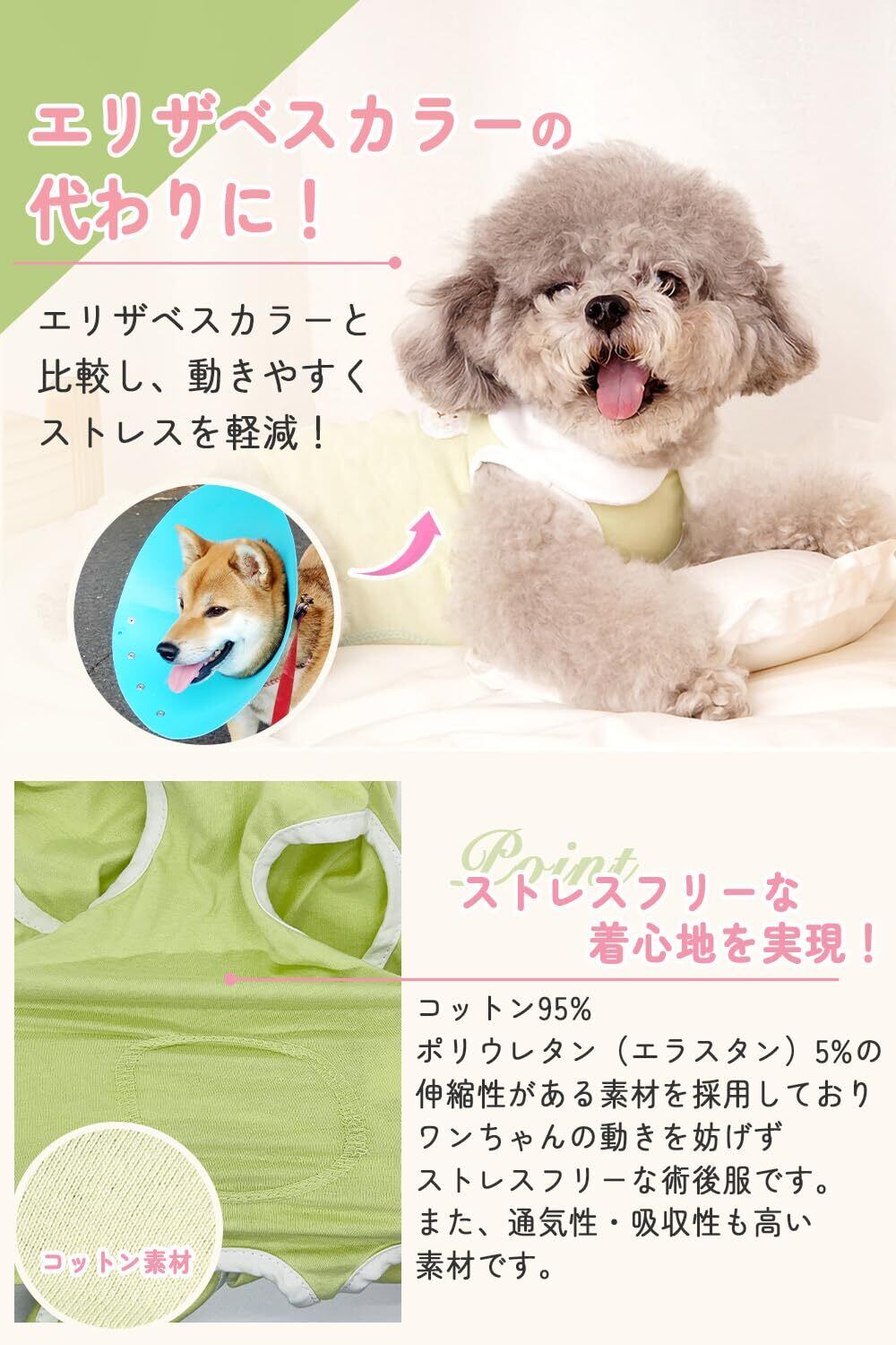 【獣医師監修の術後服】従来では,避妊手術などによる傷跡を保護するためにエリザベスカラーが使用されていましたが,動きが制限されワンちゃんへ負担がかかります。本製品は服を着せることによって,ワンちゃんの動きを制限することなく傷跡を保護します。