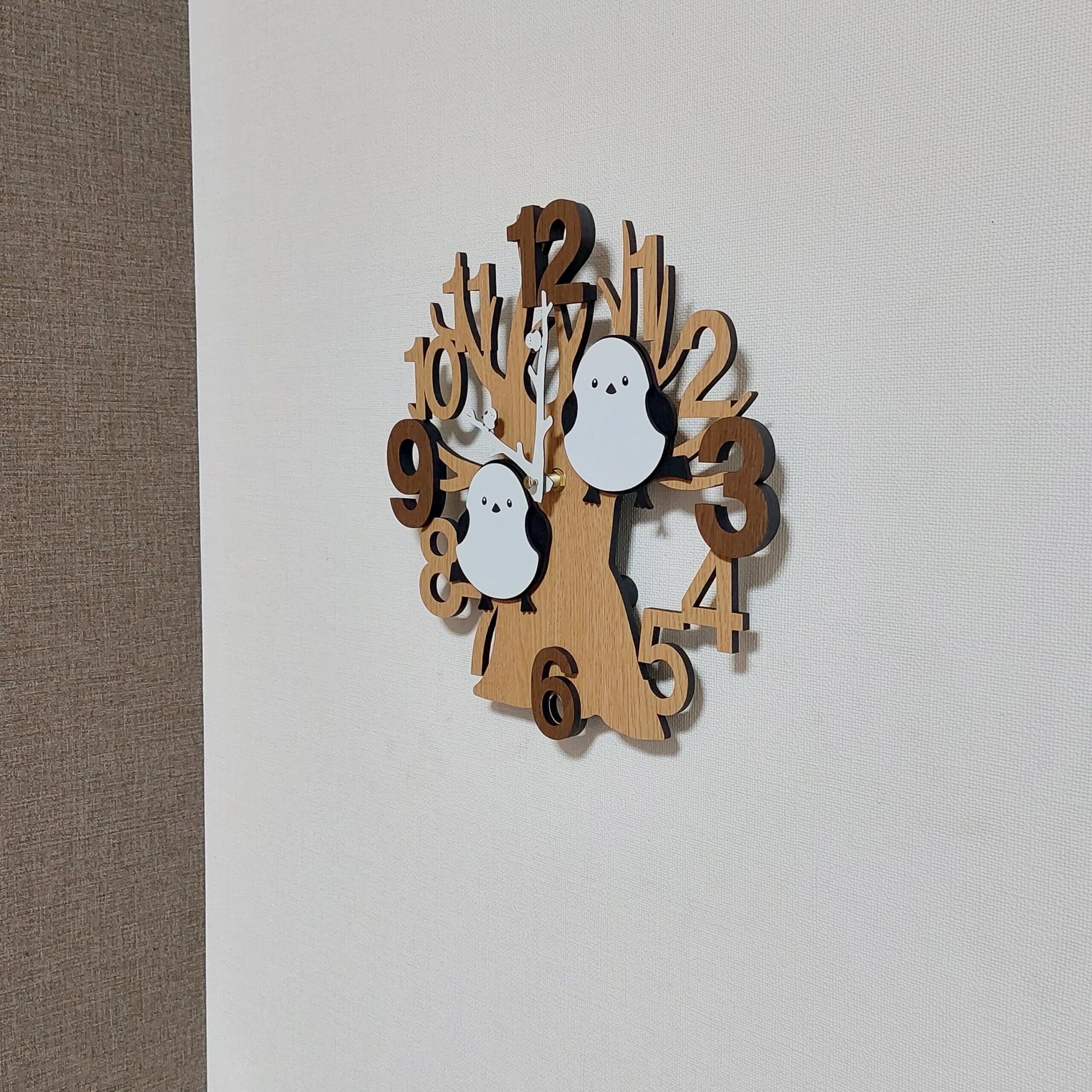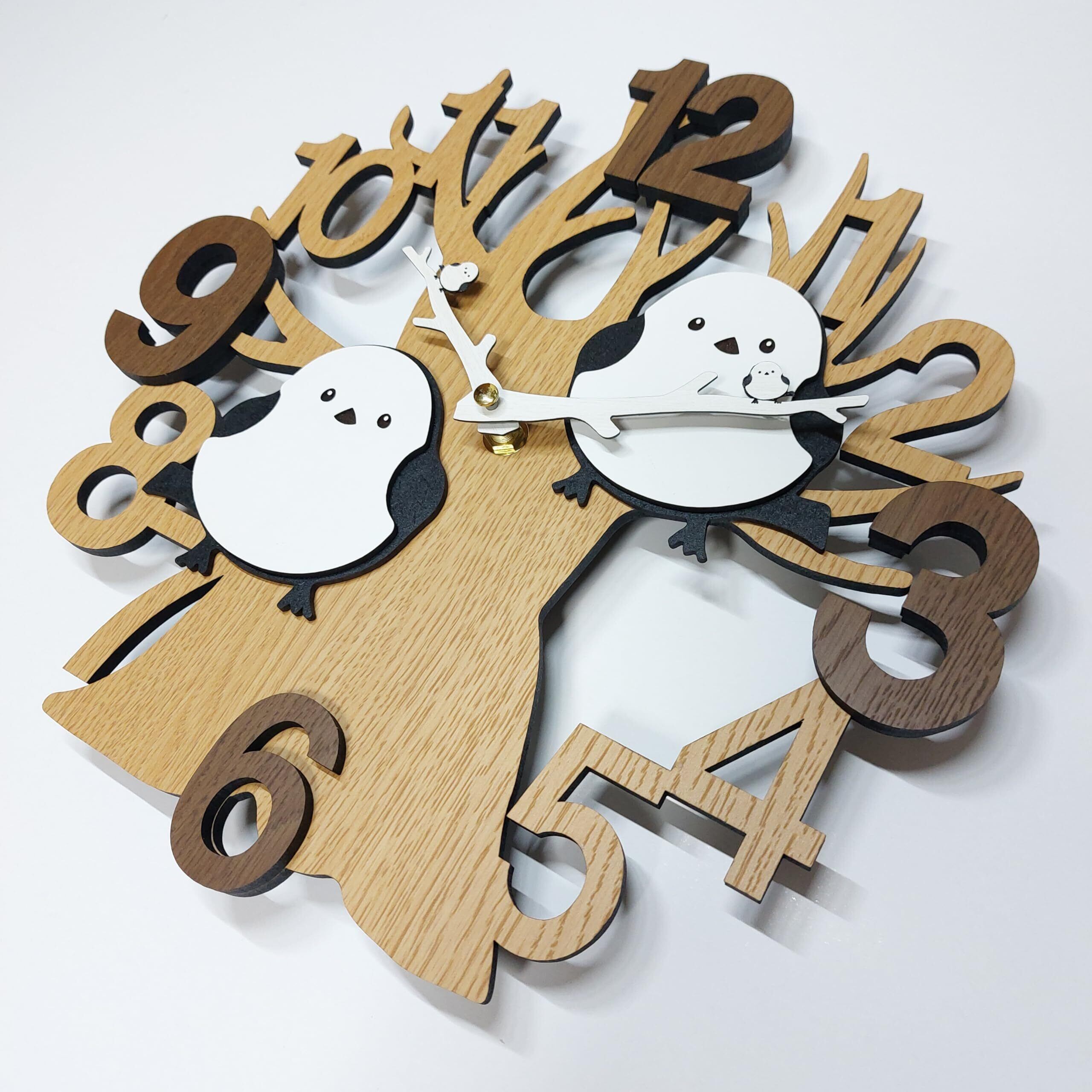 木とシマエナガ 3D仕様! シマエナガと数字の3・6・9・12が立体的に飛び出しています。 下地の木と飛び出ているシマエナガと数字はそれぞれ、レーザーで加工後、接着して立体感を表現した高級感ある仕上がりになっています。 時計の針も白の木目の柄になっており、木(Wood)がテーマの可愛い壁掛け時計です。