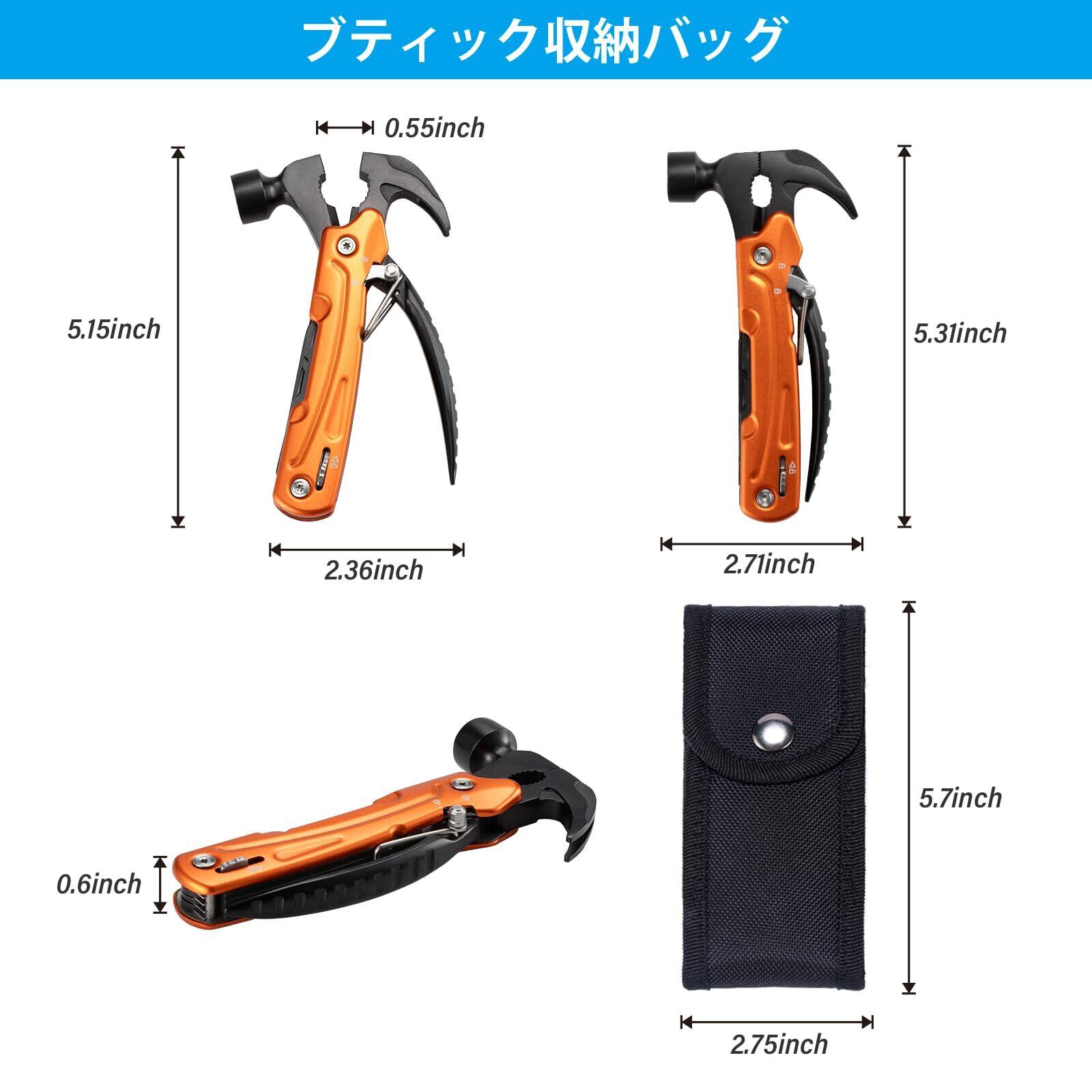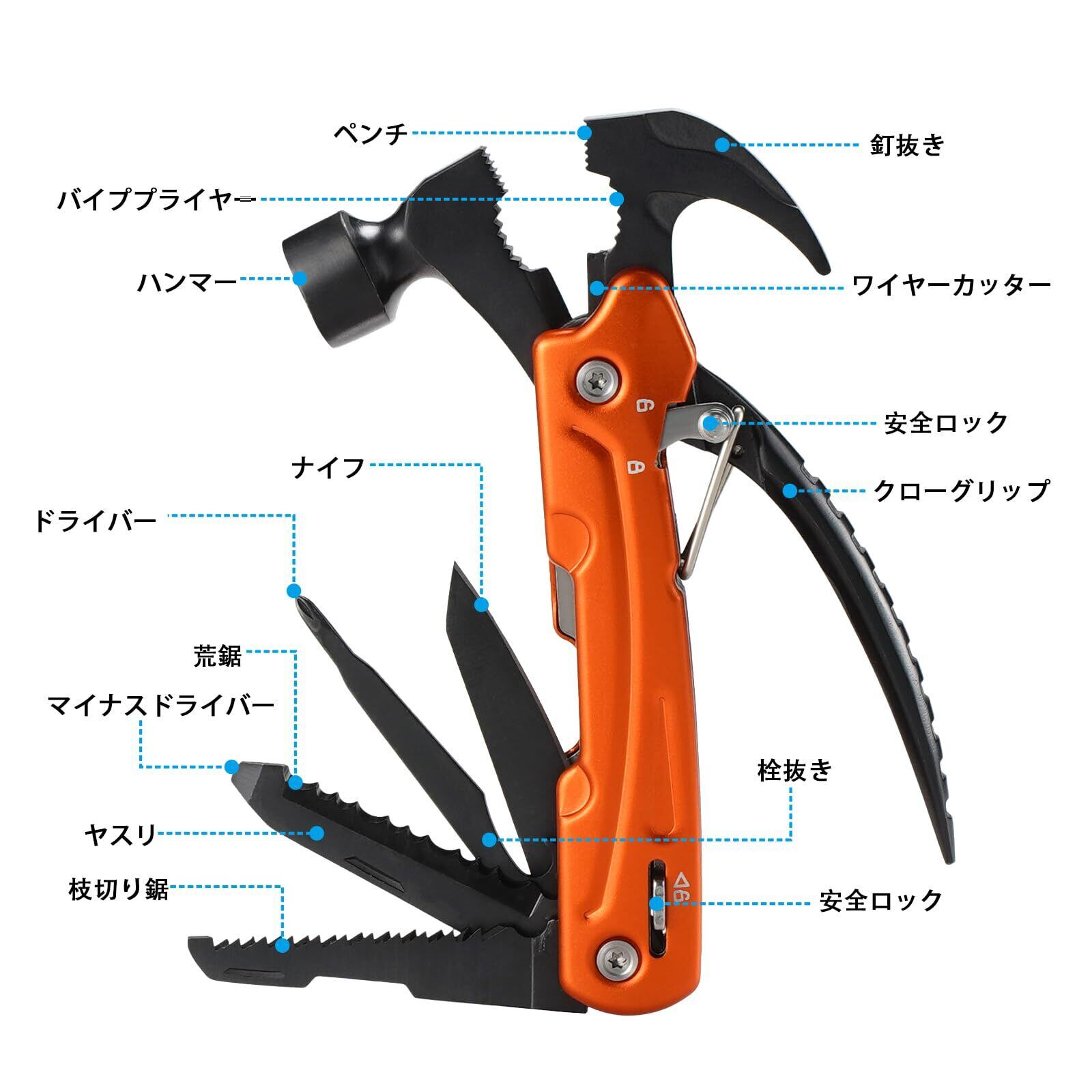 Ailenlan ペグハンマー 多機能 折り畳み 車 ハンマー 脱出 マルチツール 小型 専用ケース付き キャンプハンマー ロック機能 ステンレス製 防災グッズ 日常作業 オレンジ