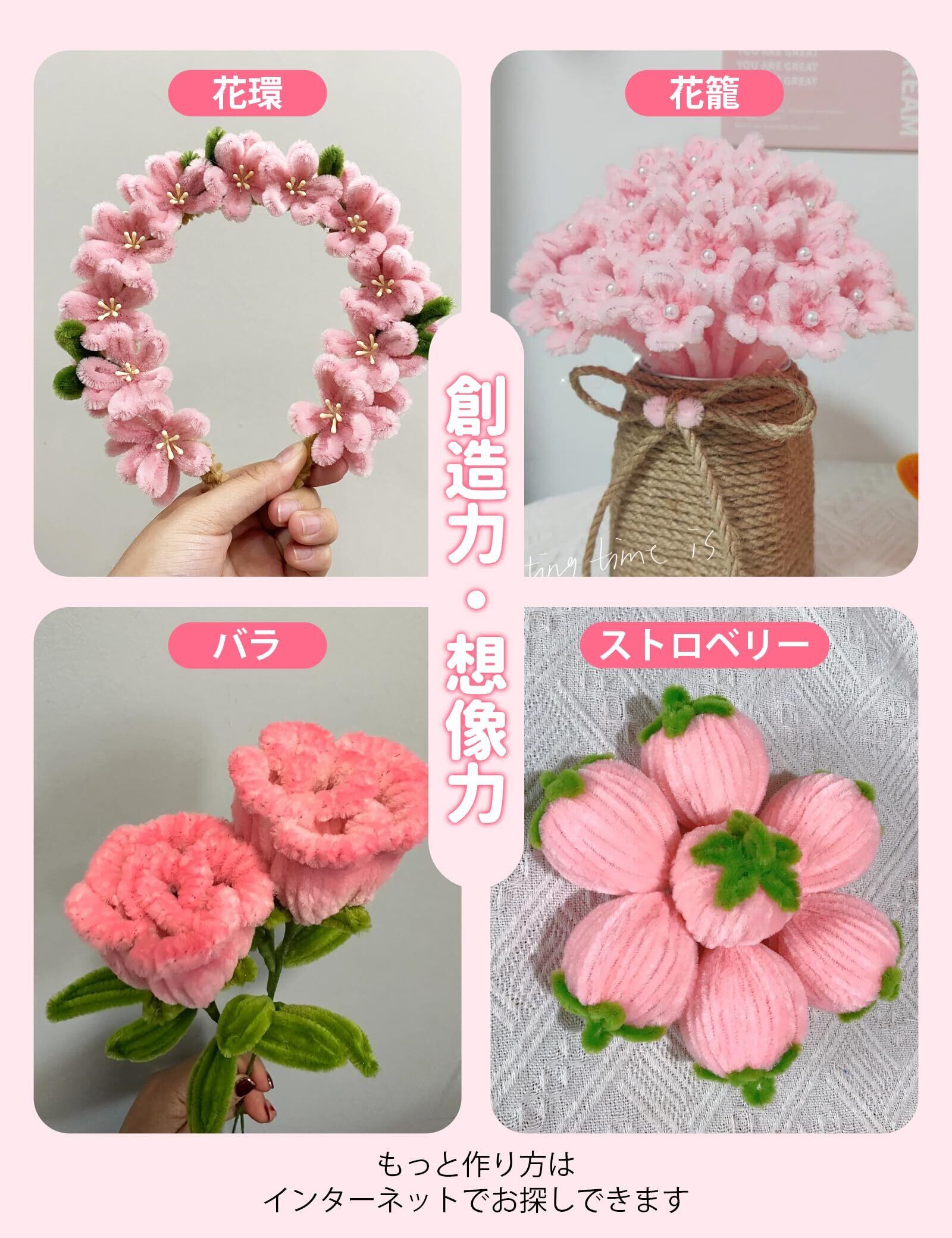 【商品仕様】セット内容:ピンク*約200本+グリーン*約100本、人工花茎*20本、フラワーテープ*1個。サイズ:手芸モール約30*0.6 cm、花茎の長さ約30cm。お客様のご意見を伺って、改良を加え、今は商品セットに説明書を付属します