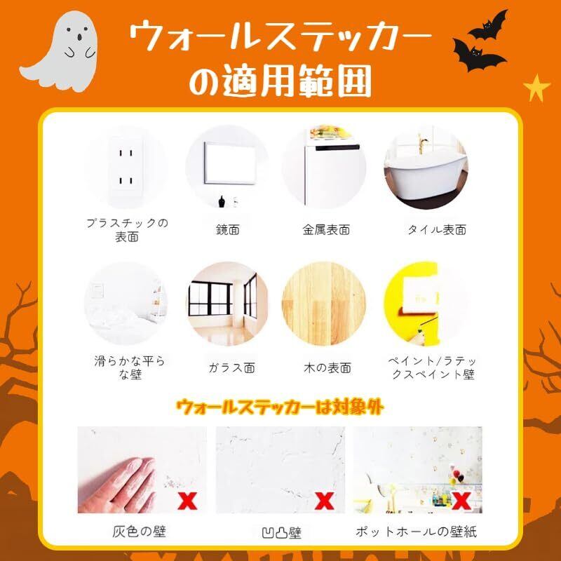 【ハロウィンに大活躍】店舗、学校、リビング、寝室、書斎、玄関、キッチン、バスルーム、トイレ、階段、ドア、窓ガラスなどに適しています。つるんとした壁面やガラス、タイルにも使えて、ハロウィン気分を盛り上げます