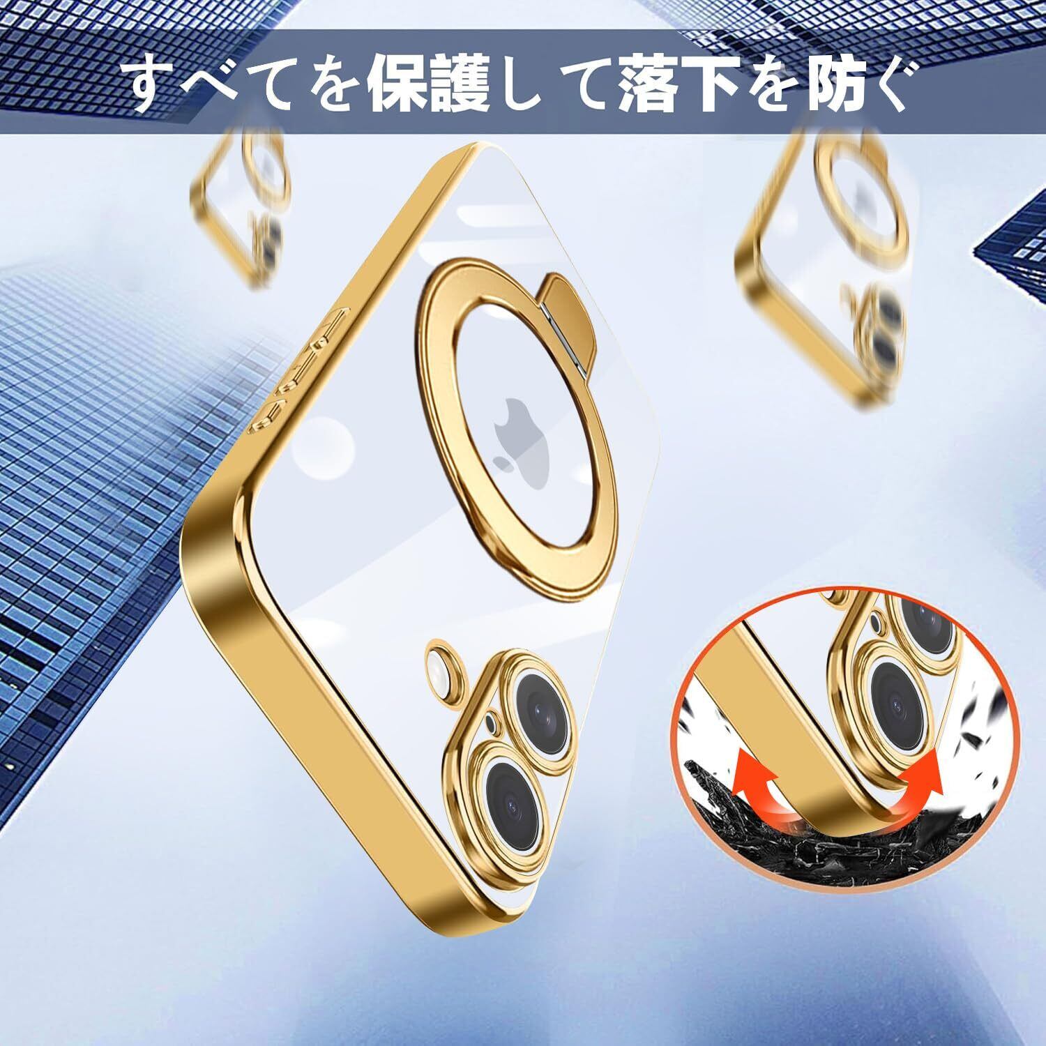 iPhone 16 Plus ケース Magsafe対応 ワイヤレス充電対応 リング付き マグネット搭載 隠しスタンド スタンド機能 縦横両対応 ストラップホール付き TPU 衝撃吸収 滑り止め 落下防止 アイフォン 16 プラス カバー (ゴールド) | impsmile