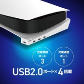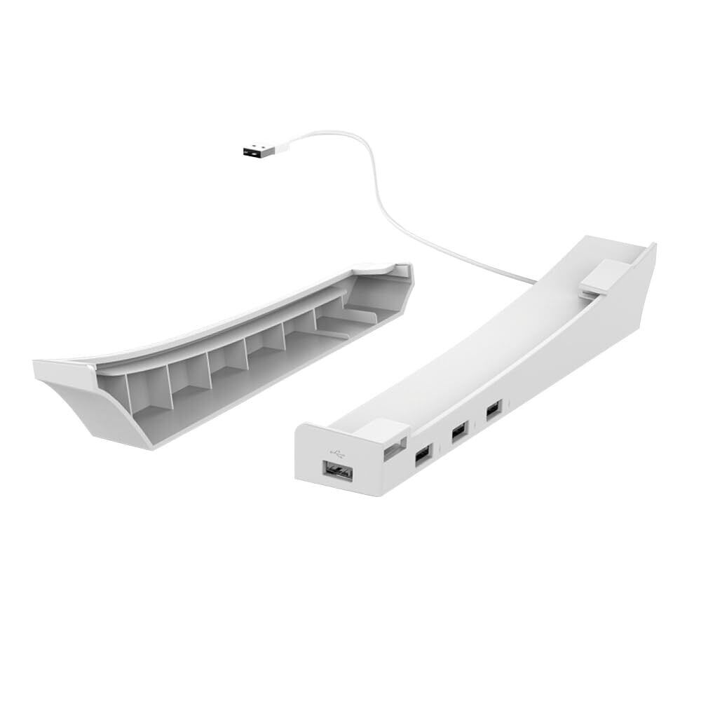 【横置きHUBスタンド】PS5をスタイリッシュに横置きできるHUBスタンドです。USB2.0 充電ポート×3ポート/データ転送ポート×1を搭載しています。