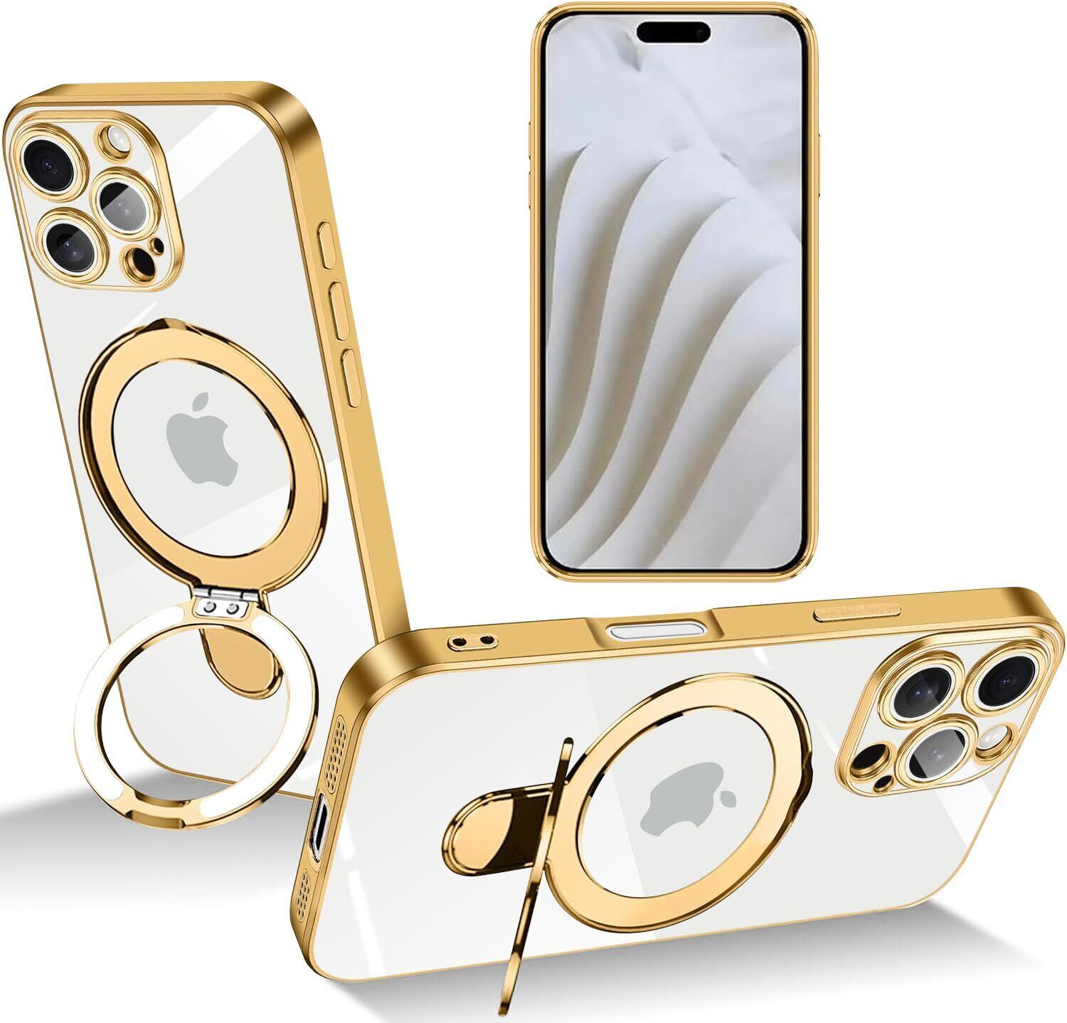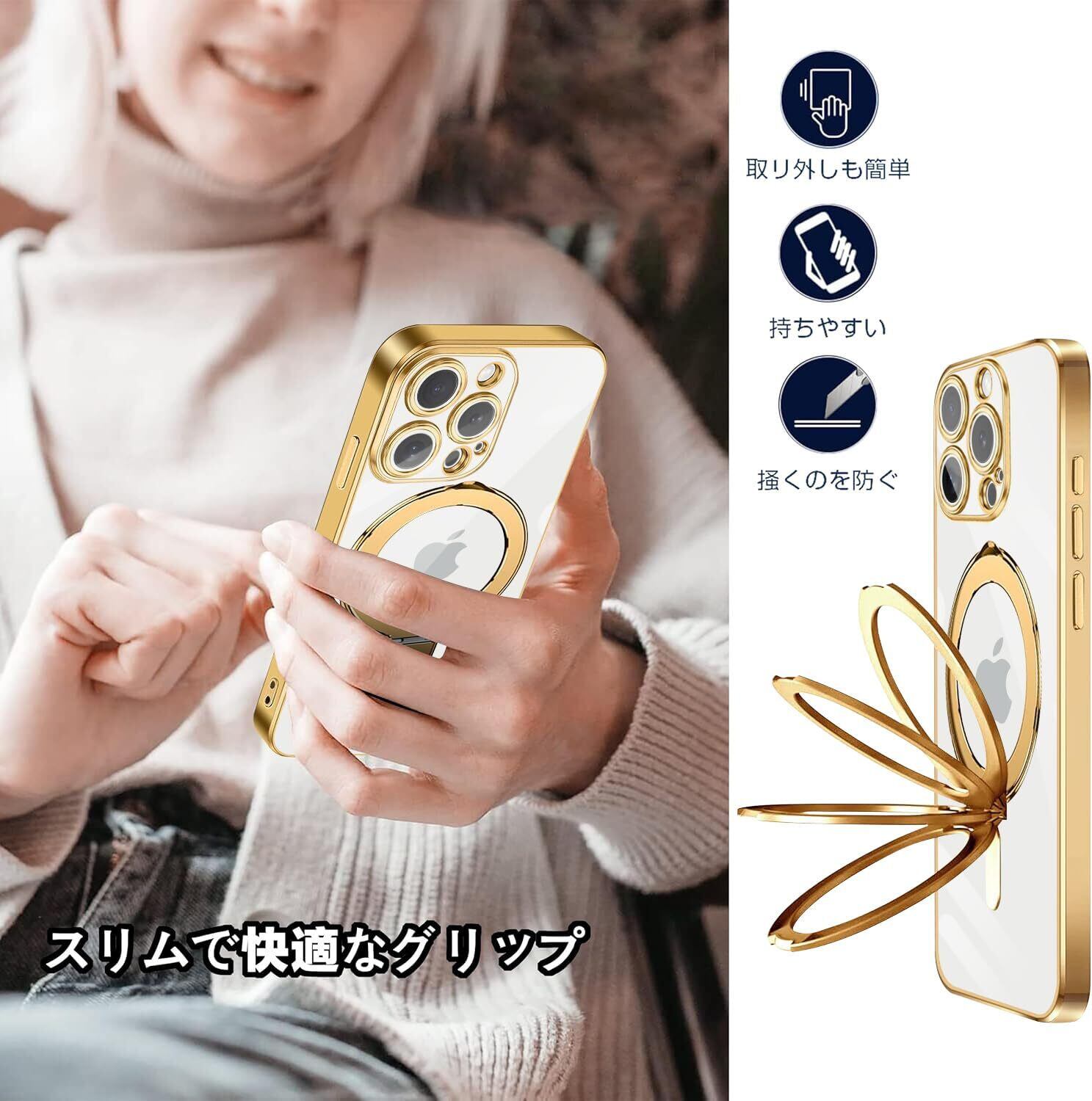 iPhone 16 Pro Max ケース Magsafe対応 ワイヤレス充電対応 リング付き マグネット搭載 隠しスタンド スタンド機能 縦横両対応 ストラップホール付き TPU 衝撃吸収 滑り止め 落下防止 アイフォン 16 プロ マックス カバー (ゴールド)