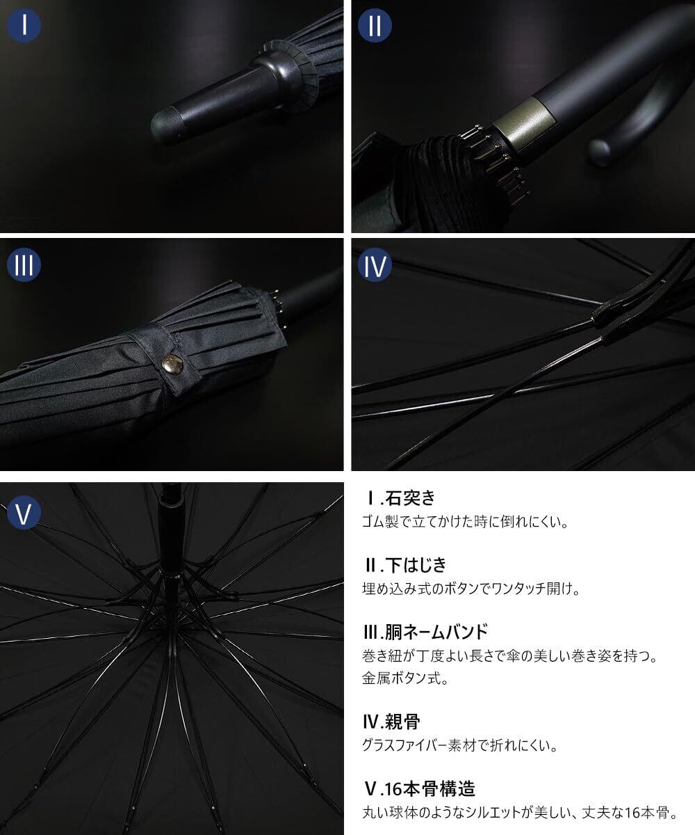 【16本骨設計&強耐風性】頑丈さ、錆びないグラスファイバーという材質を採用、従来の8本骨の2倍の16本骨にすることで今までにない強度と耐久性を実現。また、16本骨傘は8本骨傘に比べて円形に近い形状になるので見た目も美しく、男女問わず使用できる傘です。
