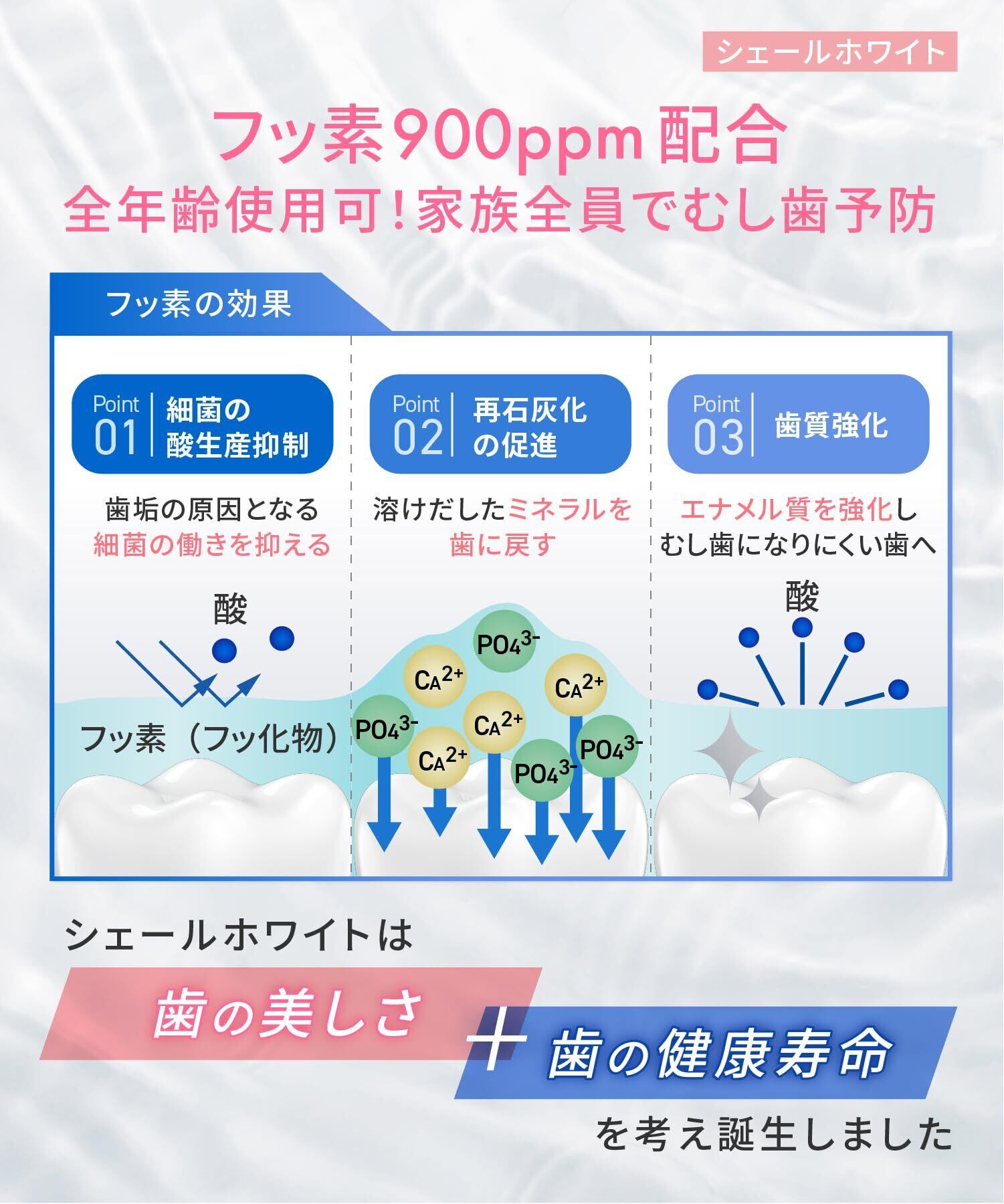 【フッ素配合で虫歯ケア】エナメル質の修復の促進(再石灰化)や、歯質強化などの効果を持つ「フッ素」を900ppm配合。むし歯対策に効果的です