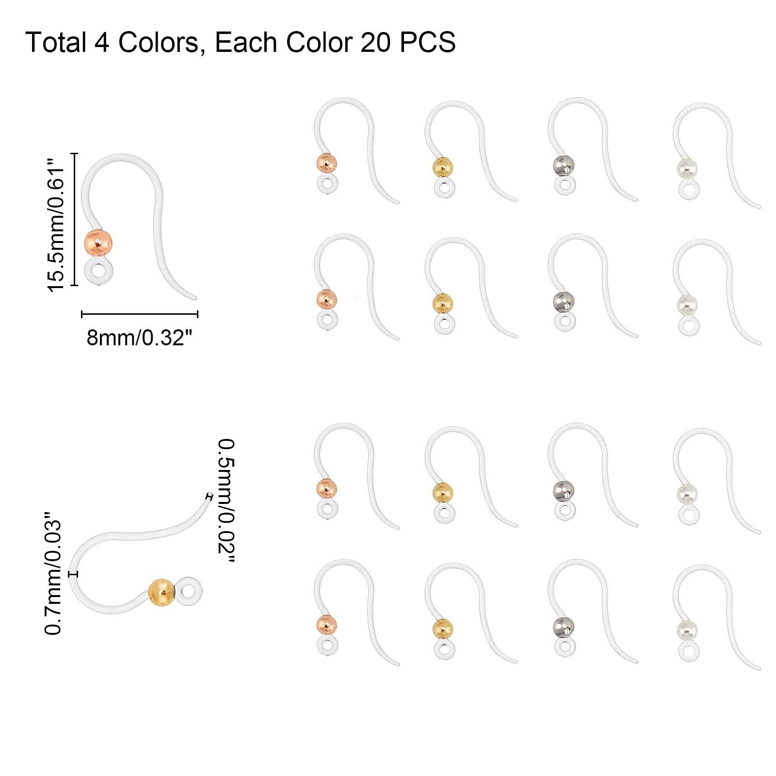 「セット&サイズ」:80セット、4色、イヤリングフック:幅約8mm、長さ15.5mm、厚さ0.7mm、穴:1.2mm、ピン:0.5mm、4色、20個/色、80個;多くのピアスパーツです、いろいろなピアスが作られます。