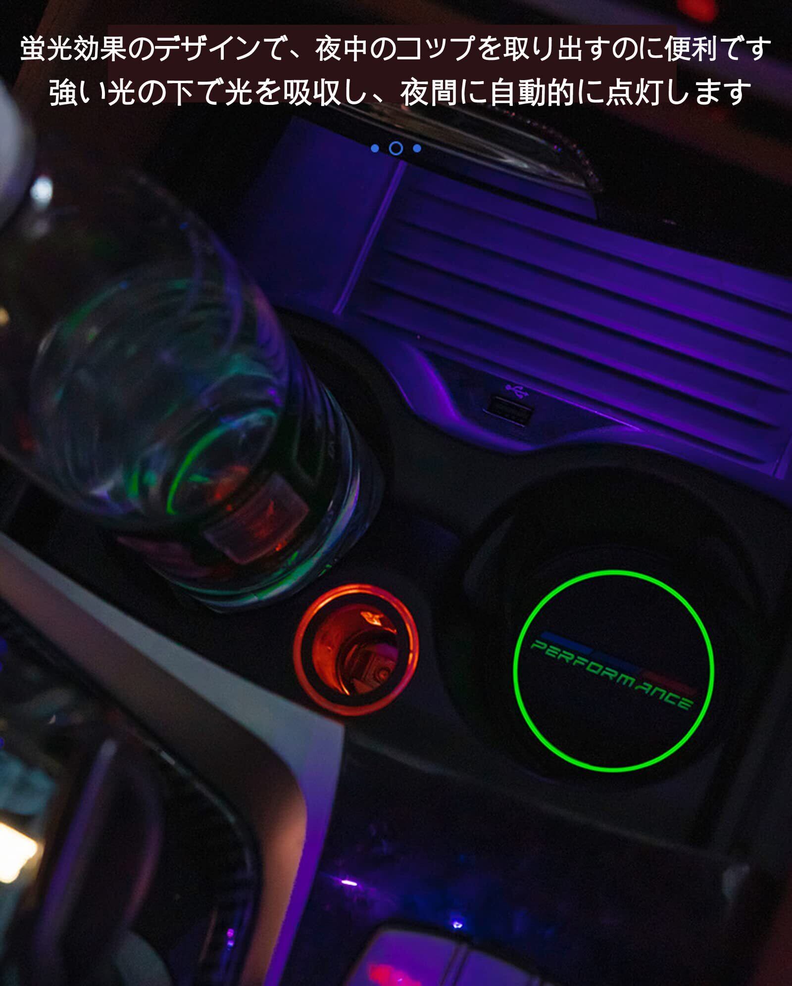 ●【デザイン】専用ロゴで、カスタマイズが好きな車のオーナーにおすすめです。車内の楽しさとスポーティさを高めます。取っ手付きで、カップコースターを持ち上げるのが簡単で便利になっています。発光デザインは強い光の下で光を吸収し、夜間に蛍光効果を生み出します。