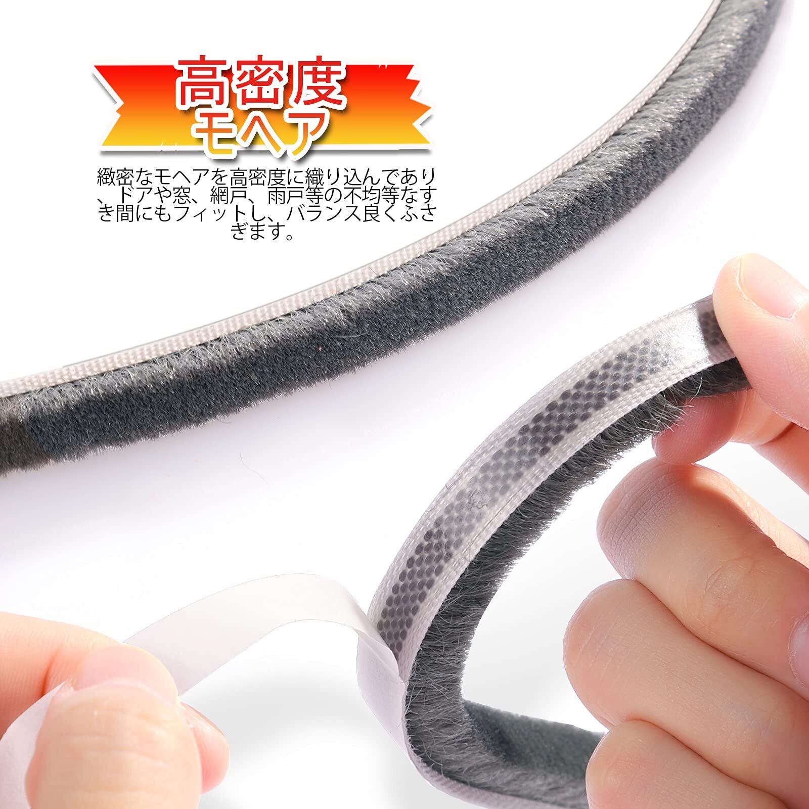 モヘア隙間テープ 緻密なモヘアを高密度に織り込んであり、ドアや窓、網戸、雨戸等の不均等なすき間にもフィットし、バランス良くふさぎます。ソフトで復元力があるモヘアタイプなので、スポンジ隙間テープより柔らかい、柔軟にフィットして、ドアや窓などの動きも損ないません。