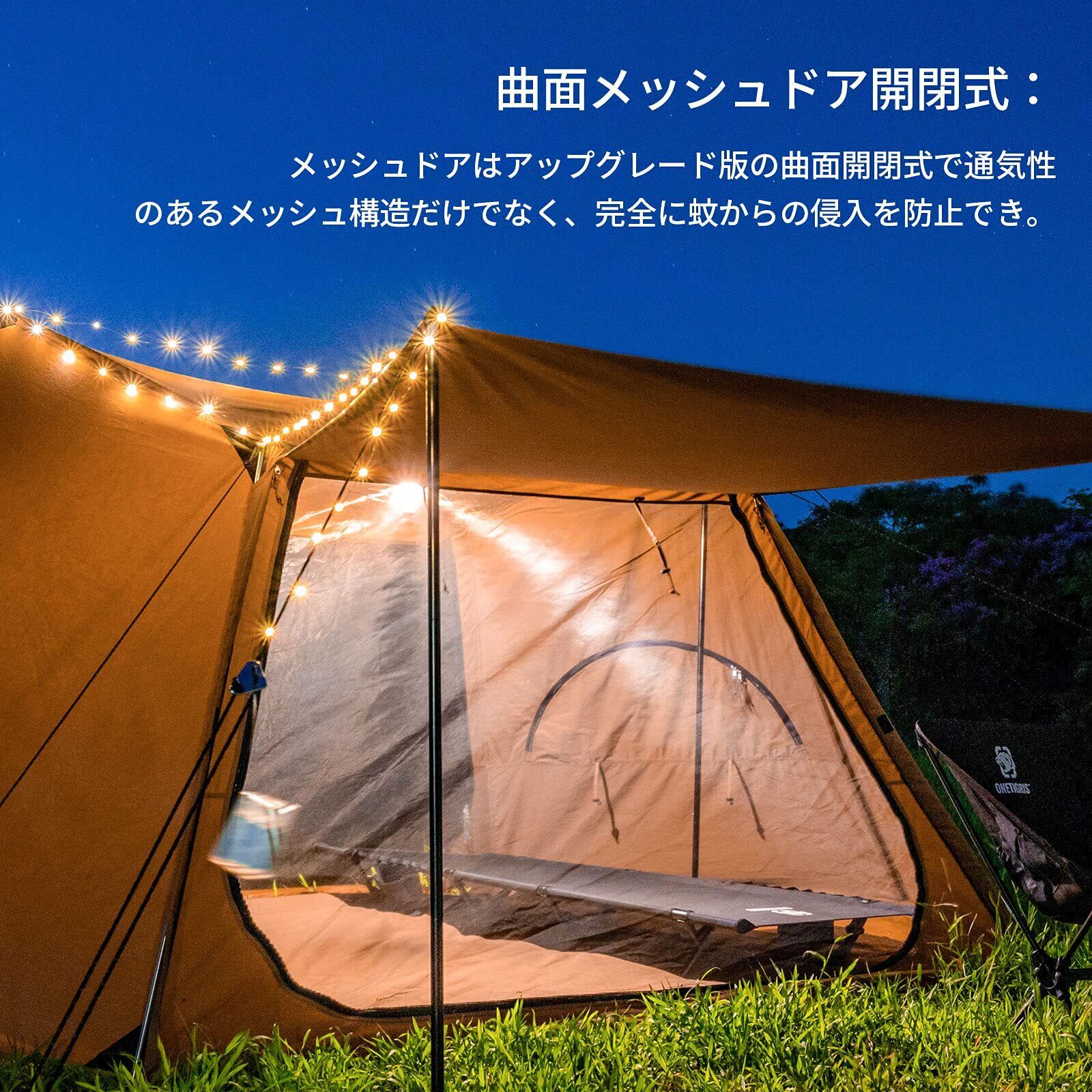 開閉式メッシュドア:【優れ通気性】両サイド開閉式のメッシュ窓と前後どちらからでも出入り可能なメッシュドアが設計されており、通 気性に優れ、テント内の蒸れや煙を素早く発散でき、快適な居心地を実現します
