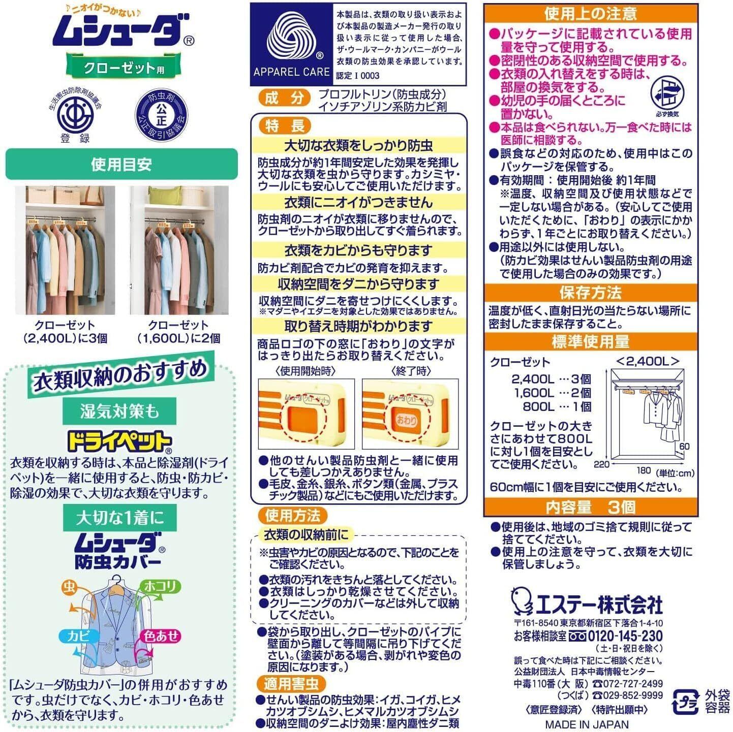 ●大切な衣類をしっかり防虫・・・防虫成分が約1年間安定した効果を発揮し大切な衣類を虫から守ります。カシミヤ、ウールにも安心してご使用いただけます。●衣類にニオイがつきません・・・防虫剤のニオイが衣類に移りませんので、クローゼットから取り出してすぐ着られます。●衣類をカビからも守ります・・・防力ビ剤配合でカビの発育を抑えます。●取り替え時期がわかります・・・正面、側面の窓におわりの白い文字が出たらお取り替えください。※使用環境によりおわりの文字は、2ヵ所同時に出ないことがあります。●効果は約1年間持続するので、長期の衣類収納に最適です。●他のせんい製品防虫剤と一緒に使用しても差しつかえありません。●毛皮、金糸、銀糸、ボタン類(金属やプラスチック製品)などにもご使用いただけます。●虫害やカビの原因となるので、下記のことをご確認ください。●衣類の汚れをきちんと落としてください。●衣類はしっかり乾燥させてください。●クリーニングのカバーなどは外して収納してください。●袋から取り出し、クローゼットのパイプに等間隔で吊り下げてください。●保存方法・・・温度が低く、直射日光の当たらない場所に密封したまま保存すること。●標準使用量・・・(クローゼット)2,400L・・・3個、1,600L・・・2個、800L・・・1個です。※クローゼットの大きさにあわせて800Lに対し1個を目安としてご使用ください。60cm幅に1個を目安にご使用ください。