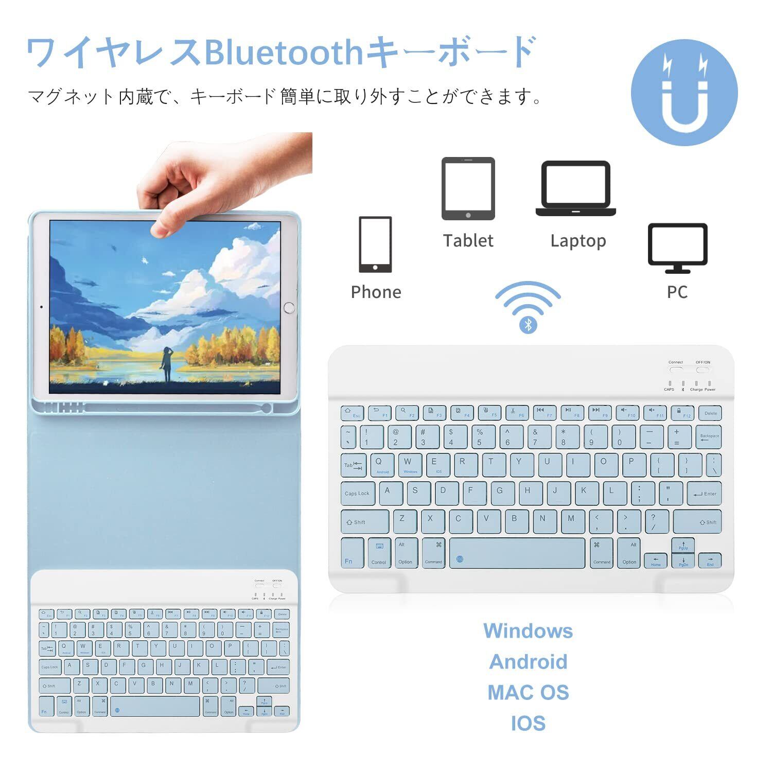 iPad 10.2 ケース 第9/8/7世代 Bluetooth キーボード付きカバー iPad通用 脱着式 ペンホルダー付き スタンド機能 オートスリープ機能 多角度調整 傷つけ防止 耐久性 (スカイブルー)