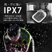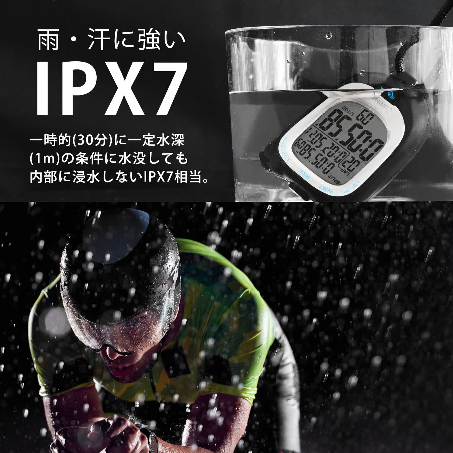 1/100秒計測、ラップタイム、スプリットタイム、カウントダウンタイマー、カウント、アラーム、100メモリー、カレンダー・時刻、操作音ON/OFFの多機能ストップウォッチ。防水性の高いIPX7仕様のため、雨や汗にも強く、丈夫な作りになっています。