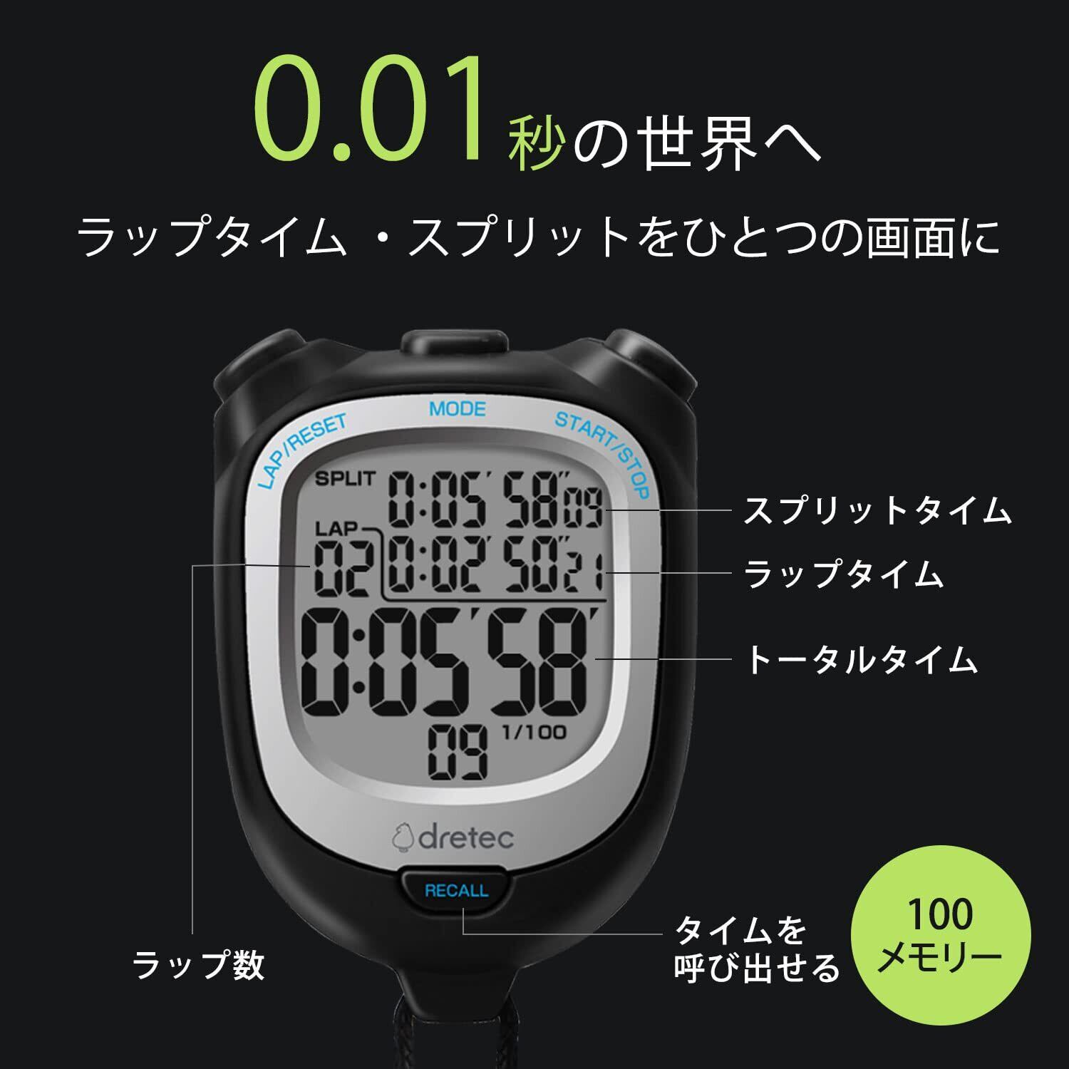 ドリテック(dretec) 防水(IPX7)ストップウォッチ 0.01秒単位で計測 ラップ/スプリット機能 スポーツ 100メモリー カウント タイマー アラーム 大画面 電池交換可 ブラック