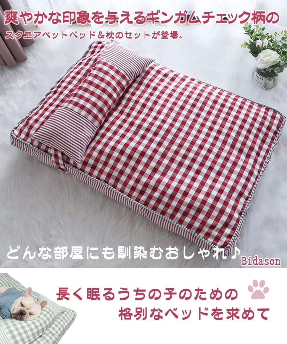 Bidason ベッド ペット クッション 猫 枕 セット チェック柄 スクエア 可愛い 綿麻風 通気 滑り止め 取り外し可能 洗える 小型 中型 キャット 犬 兼用 マット オールシーズン | impsmile