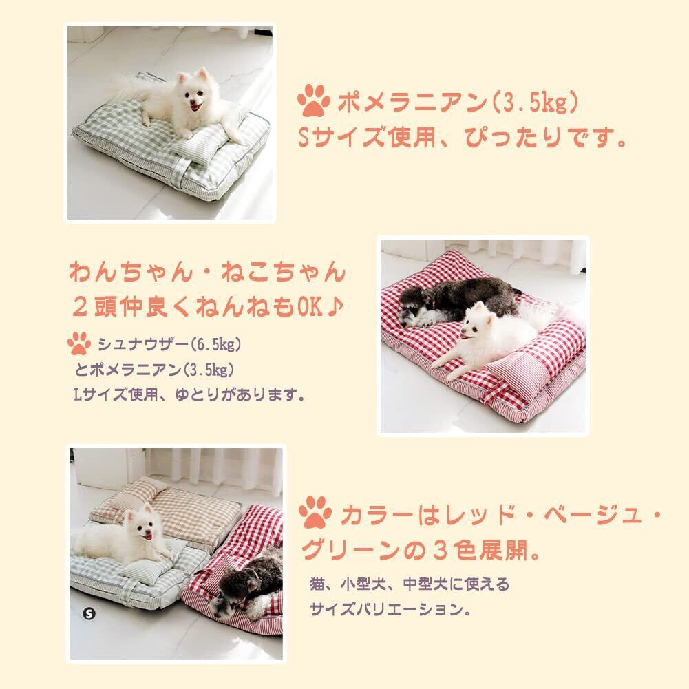 【色・サイズ選択可能】猫、小型犬、中型犬に使えるサイズバリエーション。わんちゃん・ねこちゃん2頭仲良くねんねもOKカラーはレッド・ベージュ・グリーンの3色展開です。 対応犬種目安: S:チワワ、トイプードル、猫(~5kg) M:シバ、キャバリア、猫(~10kg) L:ボーダーコリー、バグ、フレンチボルドー(~17.5kg)