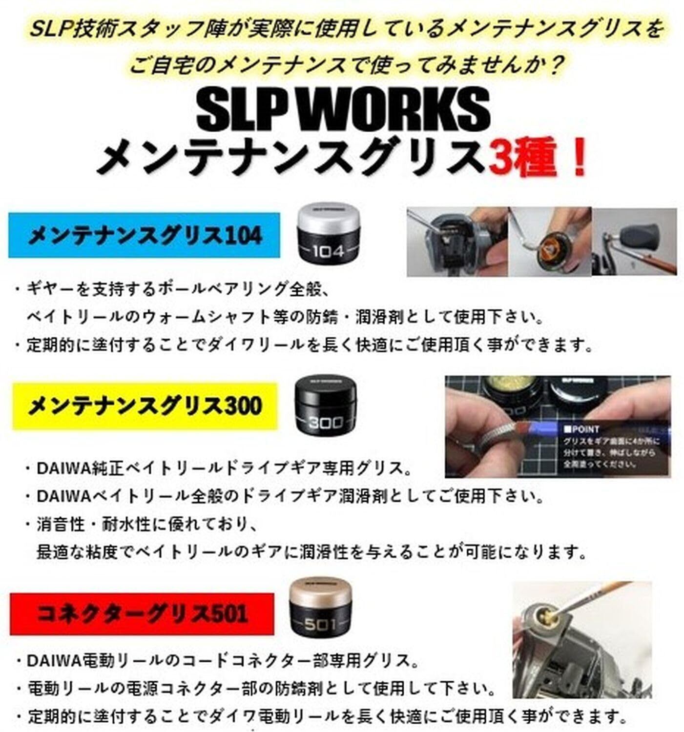 ・【SLPW メンテナンスグリス300】……「DAIWA純正ベイトリールドライブギア専用グリス」! 消音性・耐水性に優れ、最適な粘度でベイトリールのギアに潤滑性を与える。