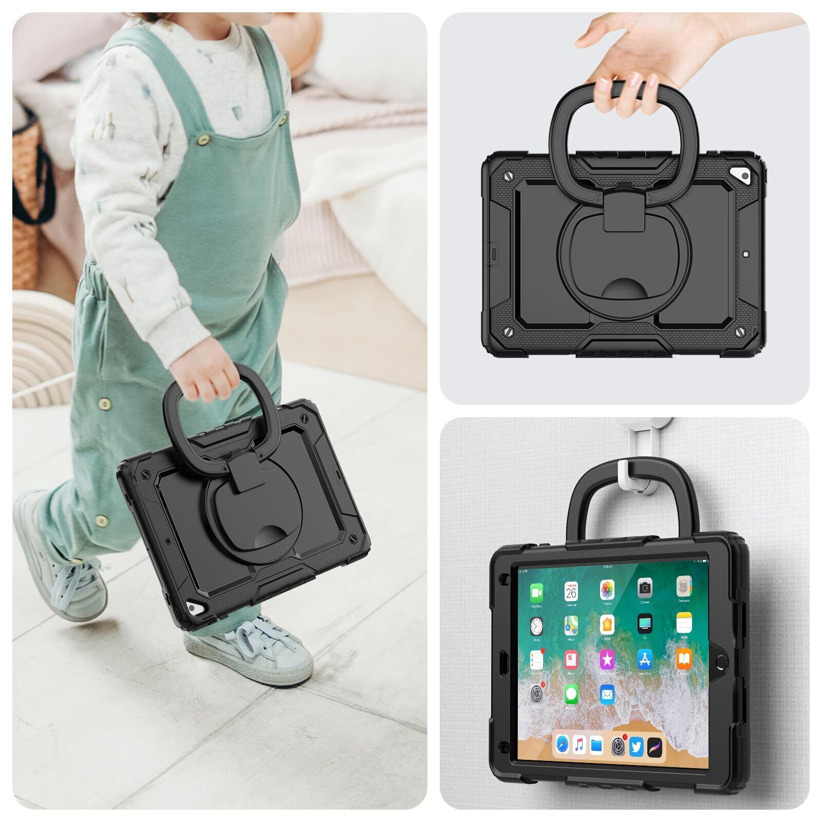 Timecity iPad 第6世代/ 第5世代/ Air2 ケース 耐衝撃 iPad 9.7 インチ リング ケース 360度回転スタンド 保護フィルム付き ペン収納 ショルダーストラップ ハンドストラップ付き 頑丈 現場 工事 傷防止 多機能 2018/ 2017 iPad 9.7インチ iPad 6/5世代 リングケース (ブラック)(適格請求書発行可能)