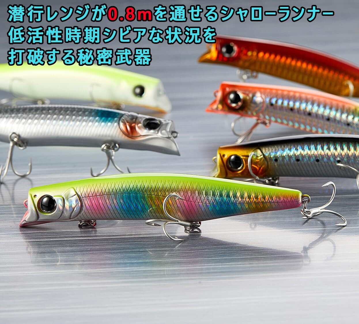 通常タイプよりやや重い約22gのウェイト設定で板鉛チューニングなどは一切不要しても流れの中でもよりタイトで艶めかしいアクションを演出。干潟や河口はもちろん、磯やサーフなど波風が荒れていたり潮流が強い場所にもしっかり泳ぎきり、シーバスを引き寄せます。