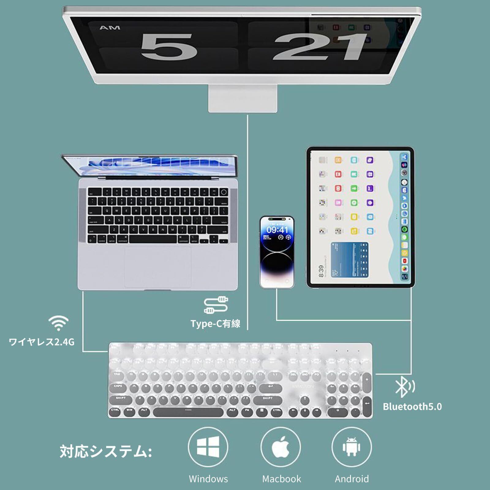 EWEADN V30タイプライターキーボード メカニカル式ゲーミングキーボード グラデーションキーキャップ 全キー防衝突 LED発光バックライト付き Windows/Mac対応 Bluetooth/2.4G/有線 オフィス&ゲーム用 104キー 英語配列 白軸 (グラデーションシルバーホワイト)