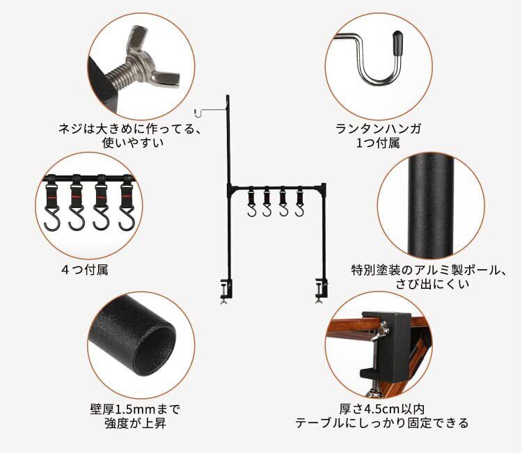 ►【テーブル用ランタンスタンド】2つの固定用クランプで地面に接触せず、テーブルに頑丈に立てられます。固い地面に使えられない心配はいりません。特別デザインされたエンドロックはネジで調整可能で、最大で厚さ4.5センチのテーブルに固定できますため、普通のキャンプ用テーブルには簡単対応できるようになっております。