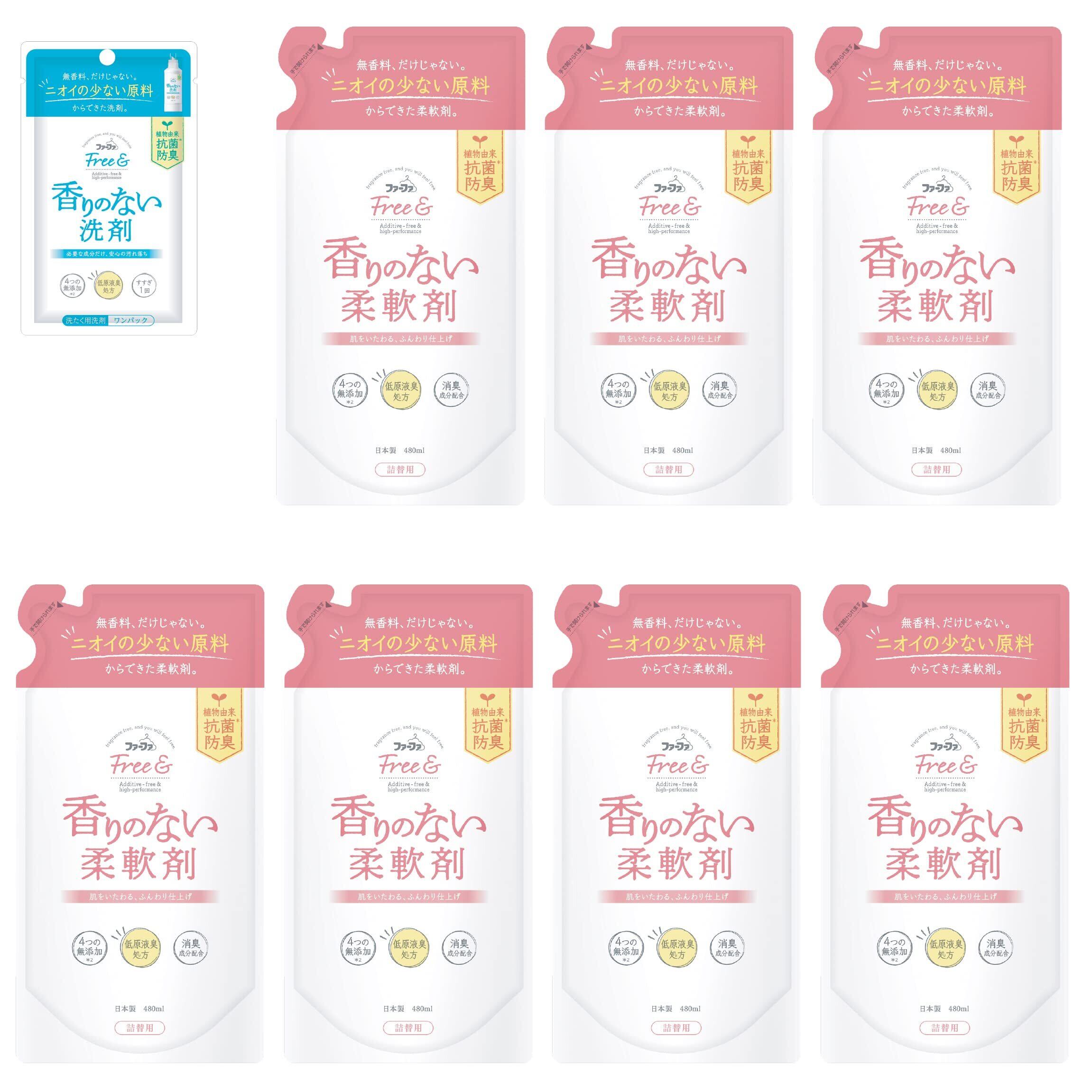 ファーファ 濃縮 柔軟剤 無香料 フリー& ( フリー アンド ) 詰替 ( 480ml ) 7個 セット 液体洗剤 フリー& お試し ワンパック ( 20g ) 付き