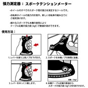 【使用方法】1.レバーを握り上側ノブを下げます。2.スポークを本体ノブの隙間に装着します。3.レバーをゆっくり離します。4.本機テーブル記載の数値から、スポークの張力(kgf)が計測できます。【サイズ】横幅11.5 x長さ17 cm【測定値】137kgfまで【重量】140 g