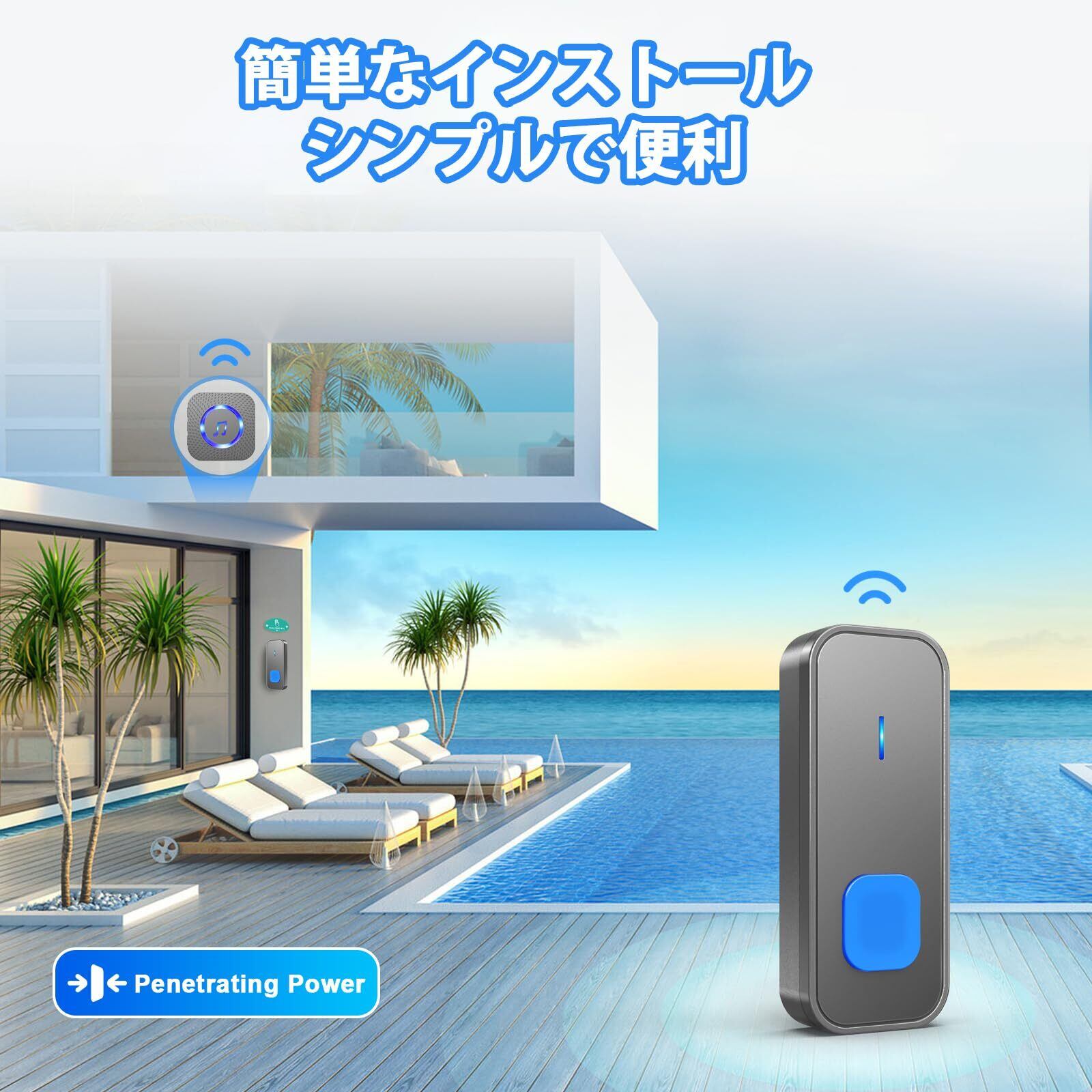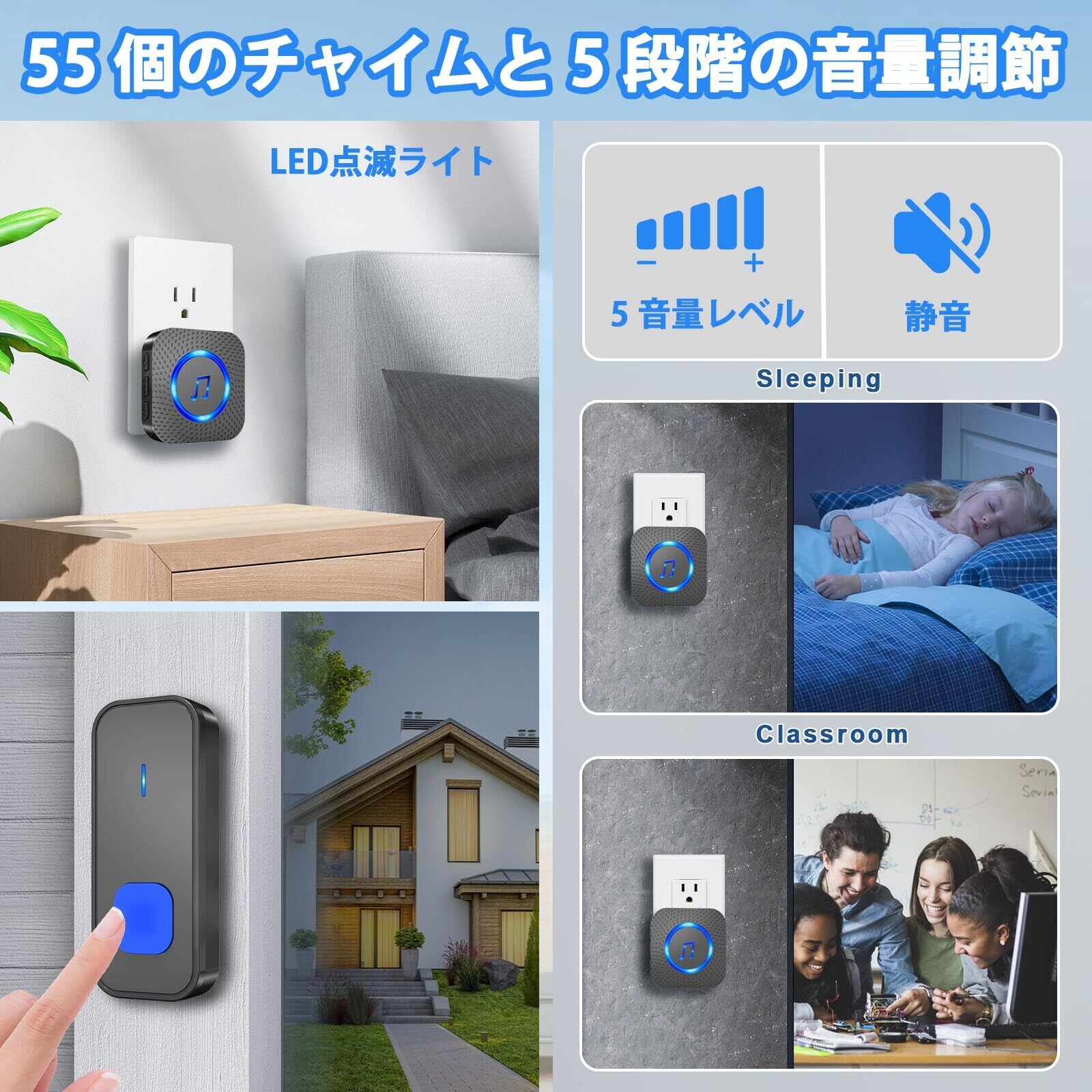 SURFOU ワイヤレスチャイム 玄関チャイム 工事不要 ドアベル 呼び鈴 電池不要 IP55防水防塵 400M無線長距離 55曲&5段階音量 室内 屋外 大音量 電池式送信機 プラグイン受信器 静音可能 LEDライト | impsmile